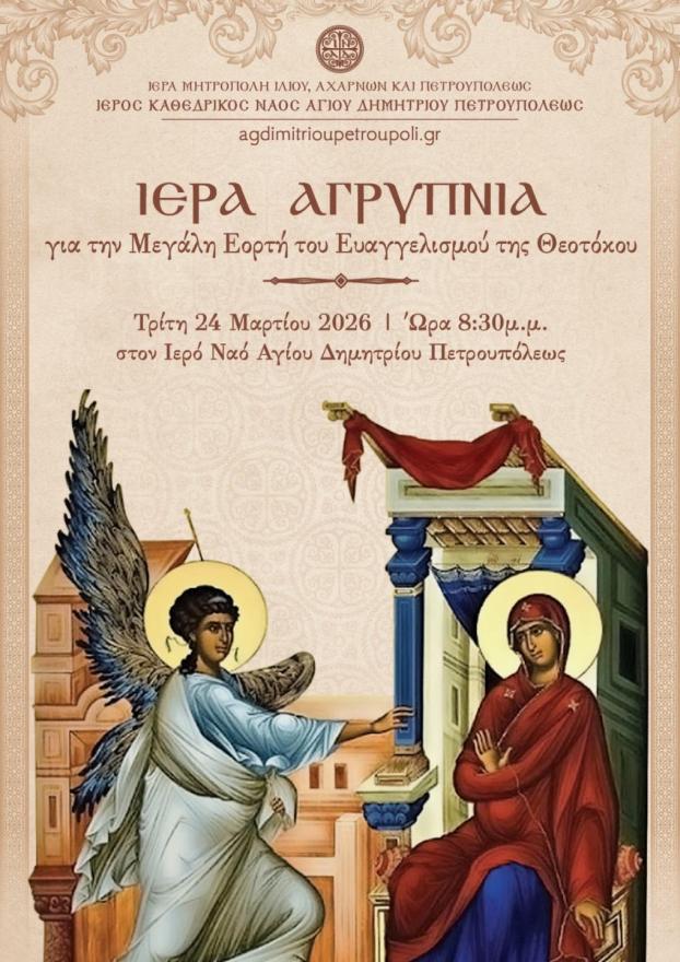 Ιερά αγρυπνία για την μεγάλη εορτή του Ευαγγελισμού της Θεοτόκου θα πραγματοποιηθεί στον Ιερό Ναό Αγίου Δημητρίου Πετρουπόλεως, την Τρίτη 24 Μαρτίου 2026, στις 20:30.