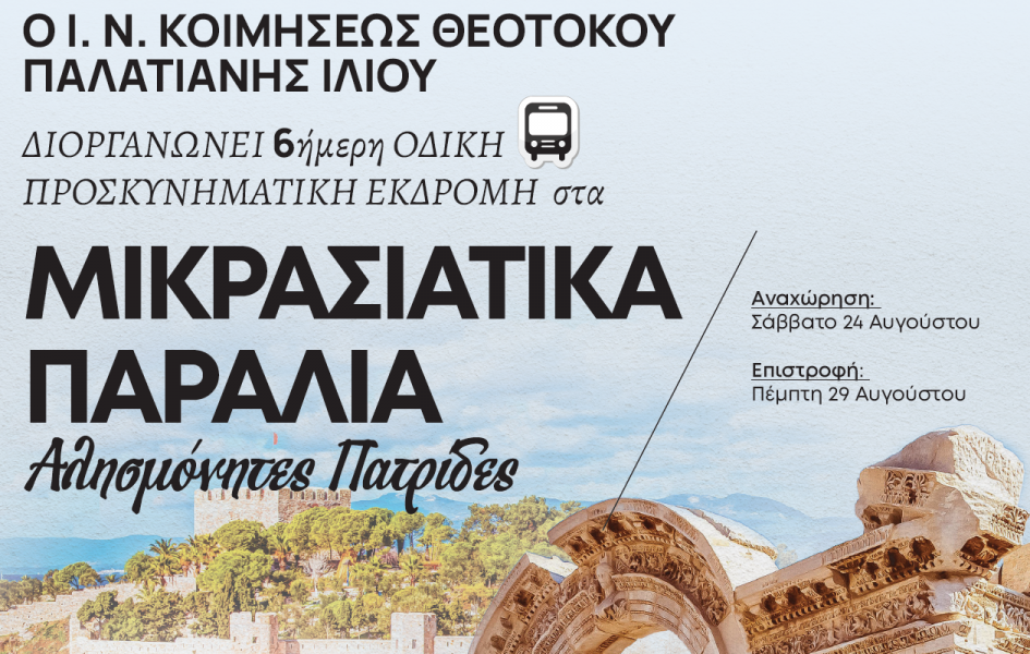 Η ενορία Κοιμήσεως Θεοτόκου Παλατιανής Ιλίου διοργανώνει 6-ήμερη οδική προσκυνηματική εκδρομή στα Μικρασιατικά παράλια, τις αλησμόνητες πατρίδες. Αναχώρηση, Σάββατο 24 Αυγούστου και επιστροφή Πέμπτη 29 Αυγούστου 2024.
