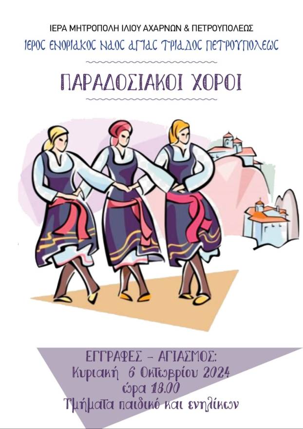 Έναρξη μαθημάτων παραδοσιακών χορών στην ενορία της Αγίας Τριάδας Πετρουπόλεως, την Κυριακή 6 Όκτωβρίου 2024, στις 18:00.