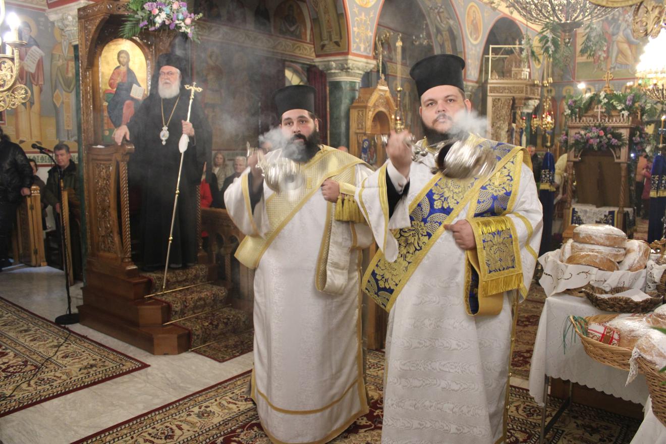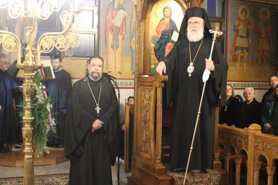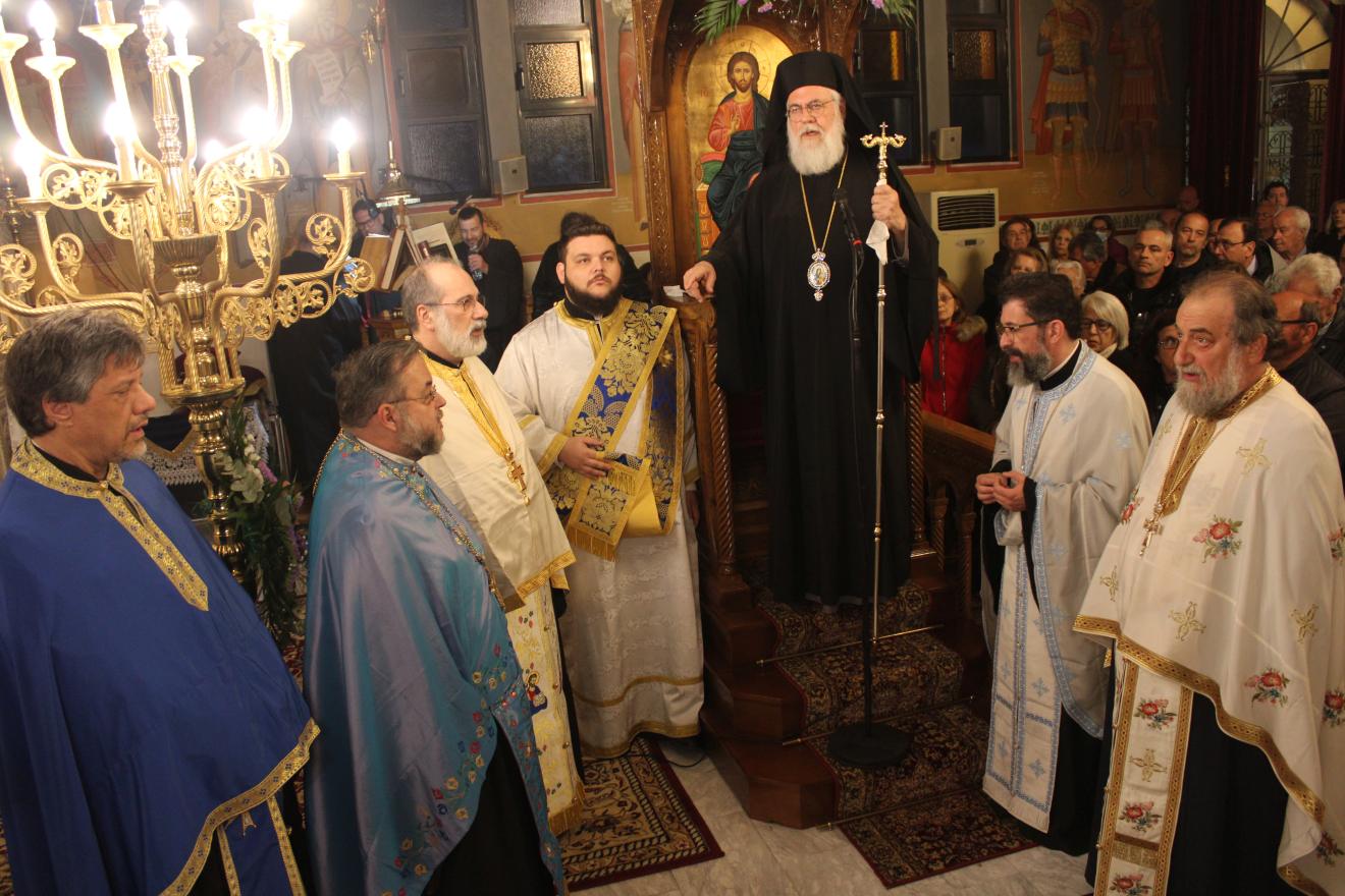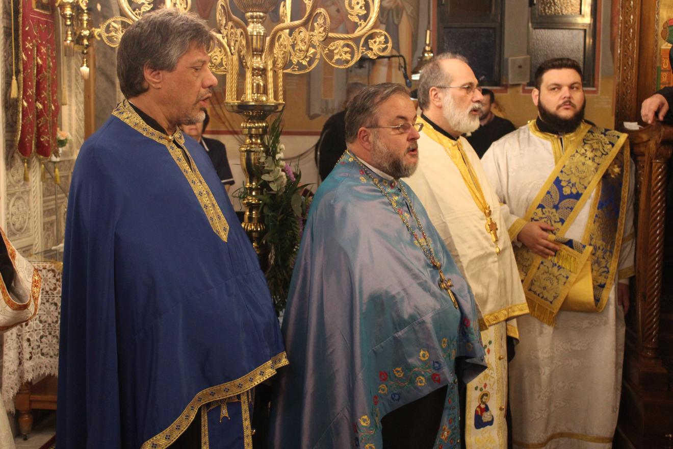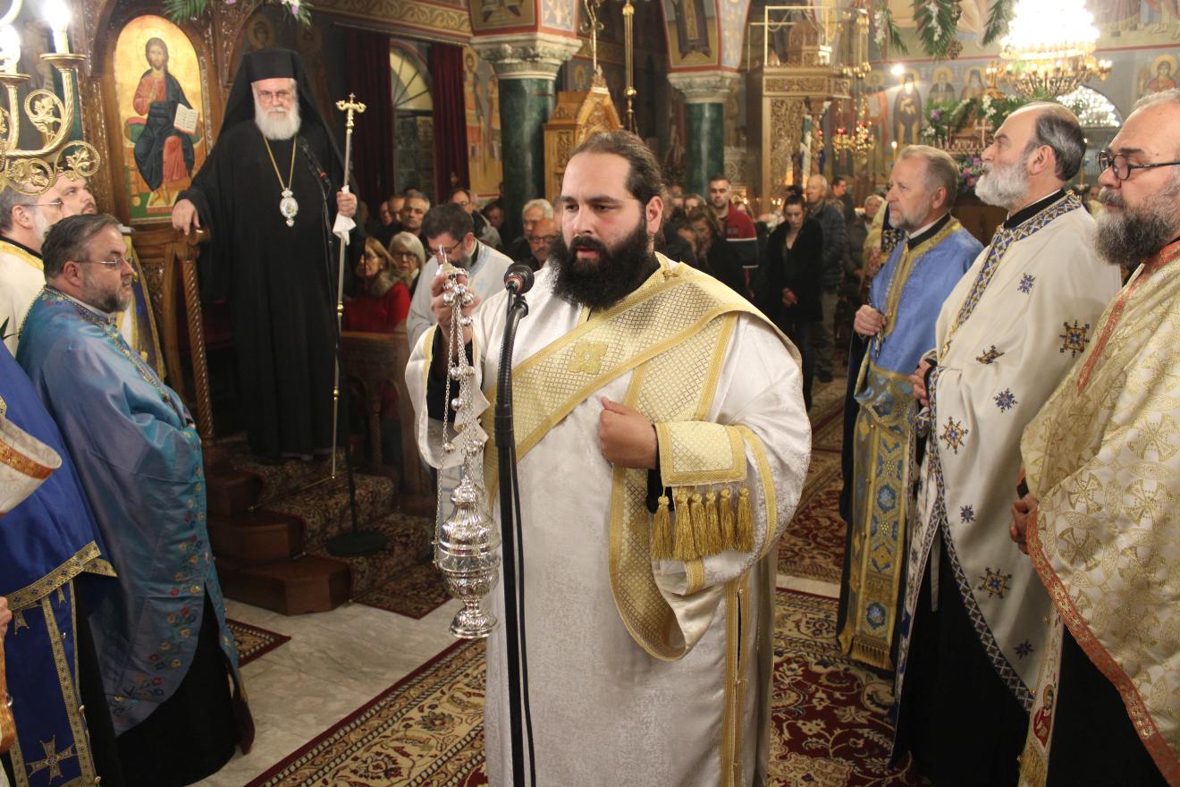 συμπαραστατούμενος από τους Αρχιμ. Ιωαννίκιο Γιαννόπουλο - ιεροκήρυκα της Ιεράς Μητροπόλεως, ο οποίος μετά τα απόστιχα μίλησε επίκαιρα για το γεγονός της Σαρκώσεως του Θεού Λόγου από την Παναγία μας, Αρχιμ. Ιωάννη Ράπτη - Γενικό Αρχιερατικό Επίτροπο της Ιεράς Μητροπόλεως, Αρχιμ. Τίτο Χρήστου - Αρχιερατικό Επίτροπο Φυλής και Αχαρνών, π. Κωνσταντίνο Τόλια - Πρόεδρο του Εκκλ. Συμβουλίου του εορτάζοντος Ιερού Ναού, π. Γεώργιο Χάρλα - Πρόεδρο του Εκκλ. Συμβουλίου του Ιερού Ενοριακού Ναού Μεταμορφώσεως του Σωτήρος Ζωφριάς, π. Κωνσταντίνο Λαμπρόπουλο - Πρόεδρο του Εκκλ. Συμβουλίου του Ιερού Ναού των Μυροφόρων Γυναικών και Νικοδήμου, π. Στέφανο Γεωργαλή - Πρόεδρο του Εκκλ. Συμβουλίου του Ιερού ενοριακού Ναού του Αγίου Στυλιανού στο Ζεφύρι, τους π. Λαμπρινό Μπουρλέσα και π. Δημήτριο Βουτσά, εφημερίους του εορτάζοντος Ιερού Ναού και τους  διακόνους του π. Άγγελο Μιχαλόπουλο και π. Καλλίνικο Ζωγράφο.