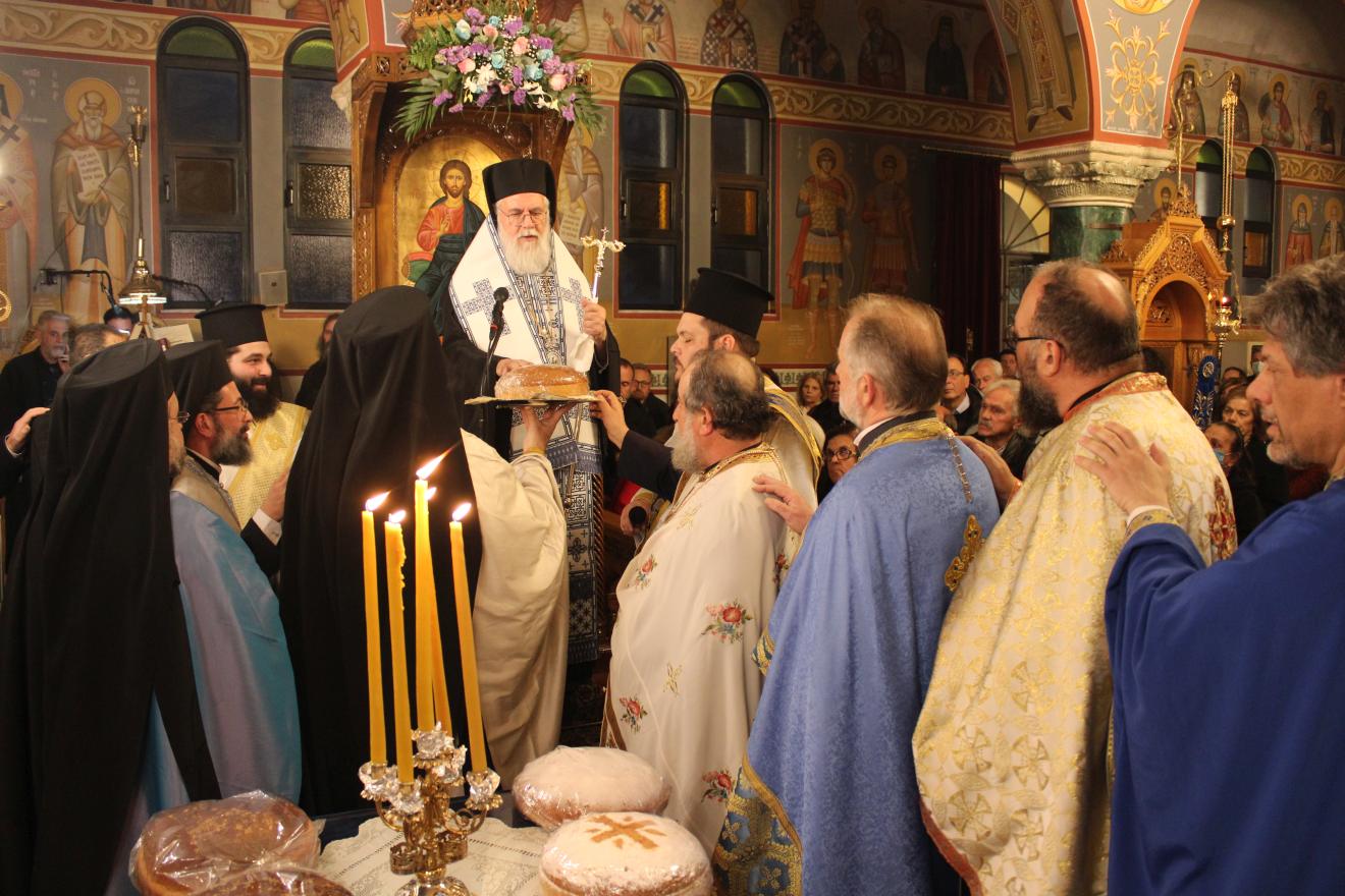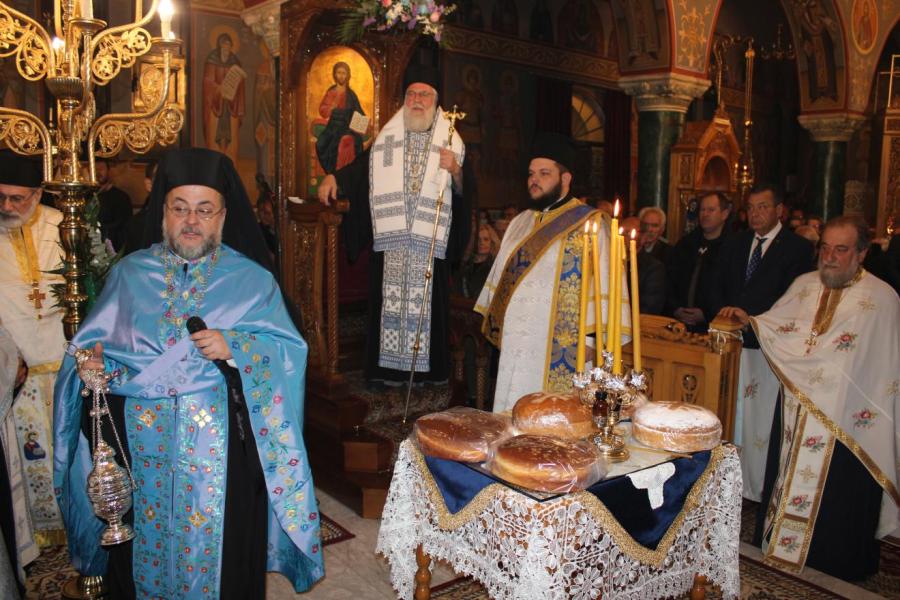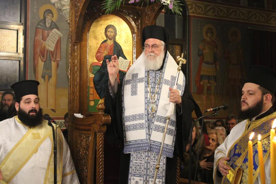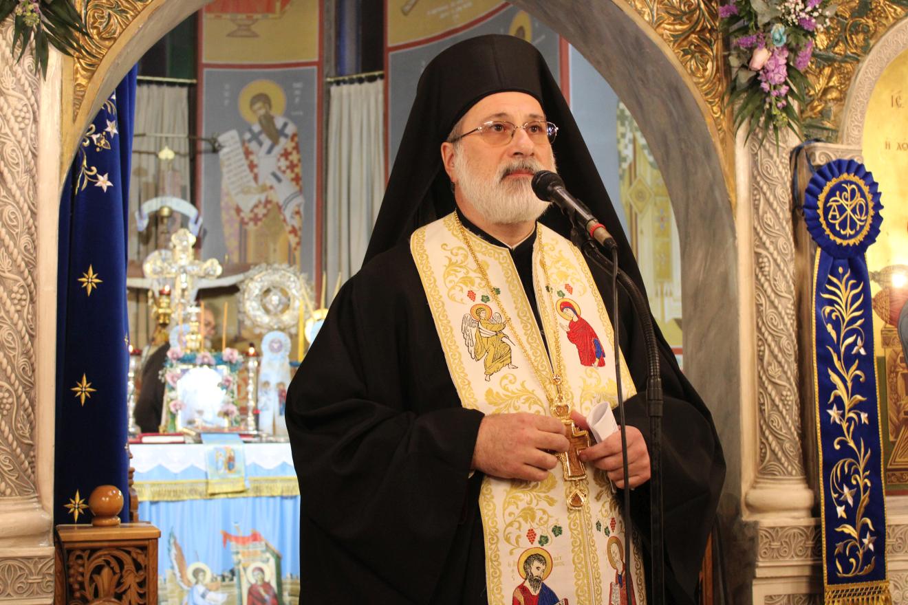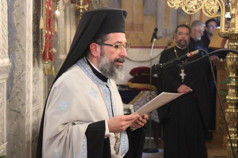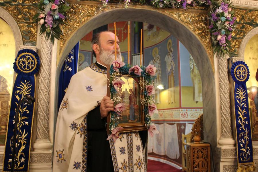 συμπαραστατούμενος από τους Αρχιμ. Ιωαννίκιο Γιαννόπουλο - ιεροκήρυκα της Ιεράς Μητροπόλεως, ο οποίος μετά τα απόστιχα μίλησε επίκαιρα για το γεγονός της Σαρκώσεως του Θεού Λόγου από την Παναγία μας, Αρχιμ. Ιωάννη Ράπτη - Γενικό Αρχιερατικό Επίτροπο της Ιεράς Μητροπόλεως, Αρχιμ. Τίτο Χρήστου - Αρχιερατικό Επίτροπο Φυλής και Αχαρνών, π. Κωνσταντίνο Τόλια - Πρόεδρο του Εκκλ. Συμβουλίου του εορτάζοντος Ιερού Ναού, π. Γεώργιο Χάρλα - Πρόεδρο του Εκκλ. Συμβουλίου του Ιερού Ενοριακού Ναού Μεταμορφώσεως του Σωτήρος Ζωφριάς, π. Κωνσταντίνο Λαμπρόπουλο - Πρόεδρο του Εκκλ. Συμβουλίου του Ιερού Ναού των Μυροφόρων Γυναικών και Νικοδήμου, π. Στέφανο Γεωργαλή - Πρόεδρο του Εκκλ. Συμβουλίου του Ιερού ενοριακού Ναού του Αγίου Στυλιανού στο Ζεφύρι, τους π. Λαμπρινό Μπουρλέσα και π. Δημήτριο Βουτσά, εφημερίους του εορτάζοντος Ιερού Ναού και τους  διακόνους του π. Άγγελο Μιχαλόπουλο και π. Καλλίνικο Ζωγράφο.