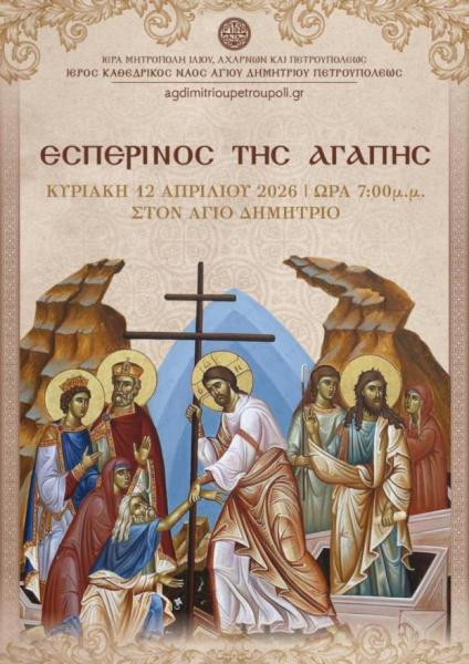 Ο Εσπερινός της Αγάπης στον Άγιο Δημήτριο Πετρουπόλεως θα τελεστεί την Κυριακή 12 Απριλίου 2026, στις 19:00.