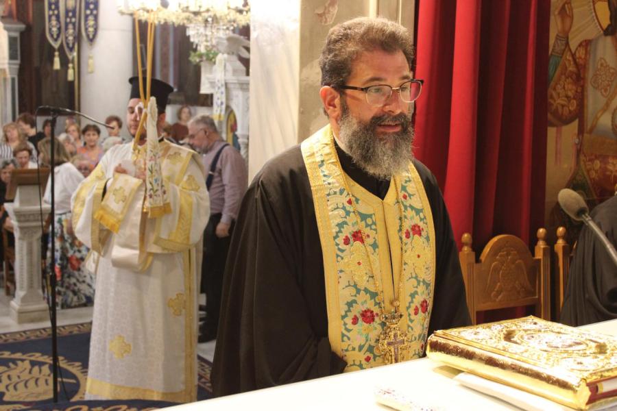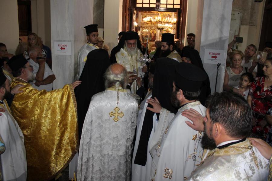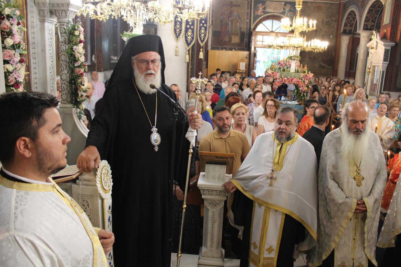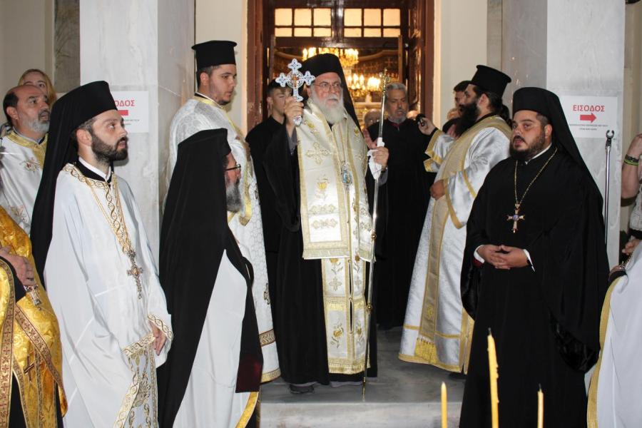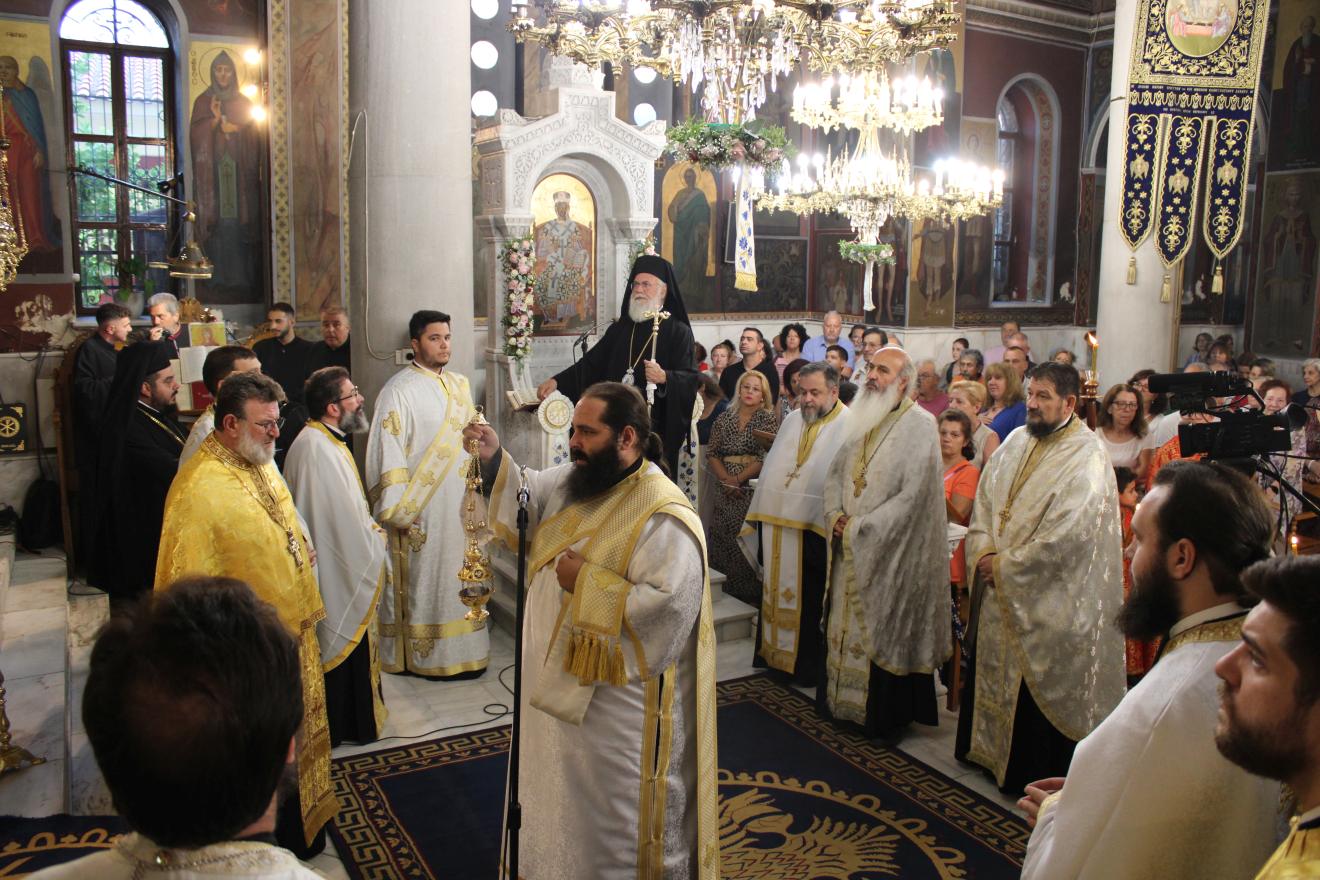 συμπαραστατούμενος από τους Αρχιμανδρίτες Ιωάννη Ράπτη - Γενικό Αρχιερατικό Επίτροπο της Ιεράς Μητροπόλεως, Τίτο Χρήστου - Αρχιερατικό Επίτροπο Φυλής και Αχαρνών, Εφραίμ Χριστοφοράκη - Αρχιερατικό Επίτροπο Πετρουπόλεως, Χρύσανθο Αλησάφη - Πρόεδρο του Εκκλ. Συμβουλίου του Ι.Ν. Αγίας Παρασκευής Αχαρνών, Χρυσόστομο Καλαθά - Πρόεδρο του Εκκλ. Συμβουλίου του Ι.Ν. Αγίου Διονυσίου Αχαρνών, τους Πρωτοπρεσβυτέρους και Πρεσβυτέρους Λάμπρο Καρίνο - Πρόεδρο του Εκκλ. Συμβουλίου του Ι.Ν. Αγίας Τριάδος Θρακομακεδόνων, Νικόλαο Πουρσανίδη - Πρόεδρο του Εκκλ. Συμβουλίου του Ι.Ν. Παμμεγίστων Ταξιαρχών Αχαρνών, Ευάγγελο Κοντογιάννη - Πρόεδρο του Εκκλ. Συμβουλίου του Ι.Ν. Αγίίου Γεωργίου Αχαρνών, Σταμάτιο Καλημέρη - Πρόεδρο του Εκκλ. Συμβουλίου του Ι.Ν. Αγίου Σπυρίδωνα Καματερού, καθώς και τον Αρχιμ. Μιχαήλ Γιαννακέλο - Πρόεδρο του Εκκλ. Συμβουλίου του εορτάζοντος Ιερού Ναού, τους εφημερίους του ιερού Ναού και ομόρων ενοριών και τους διακόνους π. Άγγελο Μιχαλόπουλο και π. Παντελεήμονα Μπακάλη.