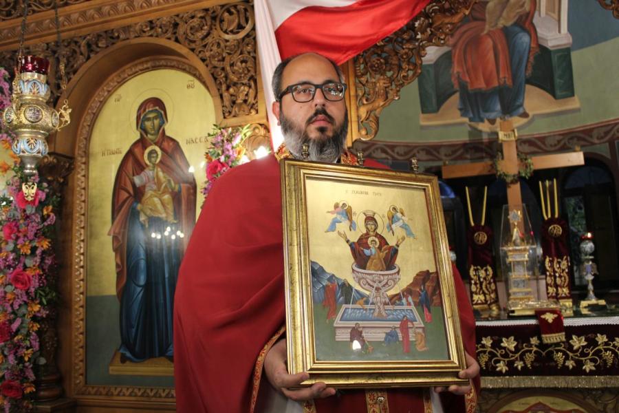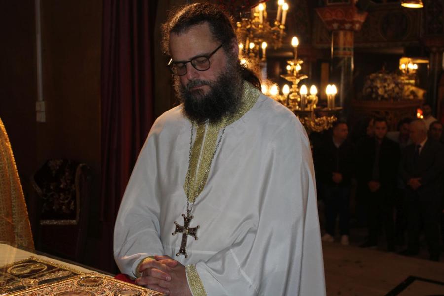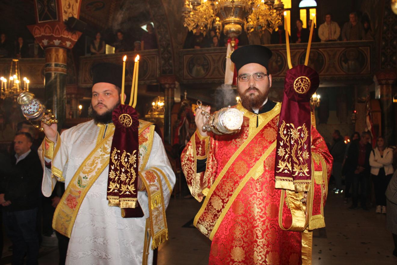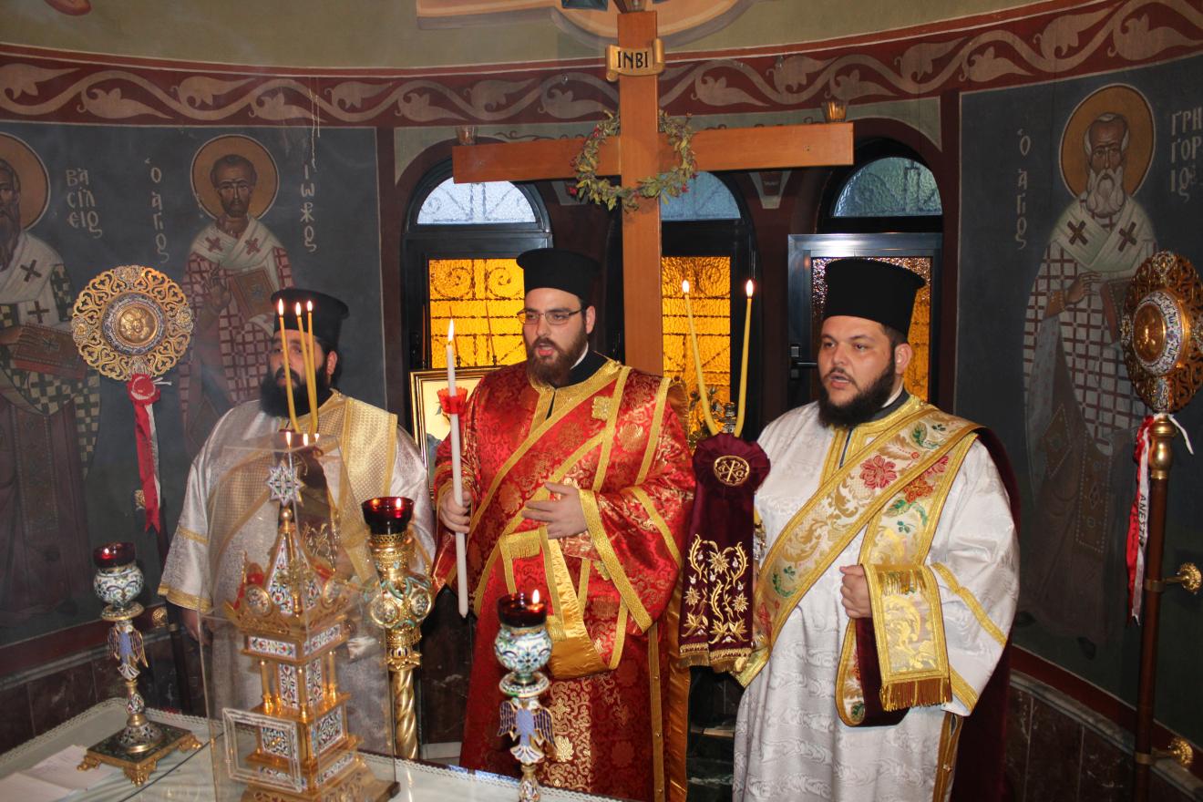 συμπαραστατούμενος από τους Αρχιμ. Συμεών Αυγουστάκη, Πρόεδρο του ΕΣ του εορτάζοντος ιερού ναού, Αρχιμ. Μάξιμο Αδαμίδη, π. Ιωσήφ Έκερτ, π. Νικόλαο Σούλη, εφημερίους του ιερού ναού, π. Γεώργιο Βασιλείου, Πρόεδρο του ΕΣ του Ιερού ενοριακού ναού της αγίας Βαρβάρας στο Ίλιον, π. Κωνσταντίνο Κασσό, Πρόεδρο του ΕΣ του Ιερού ενοριακού ναού του Προφήτου Ηλία στην Πετρούπολη και τους διακόνους του π. Άγγελο Μιχαλόπουλο και π. Καλλίνικο Ζωγράφο.