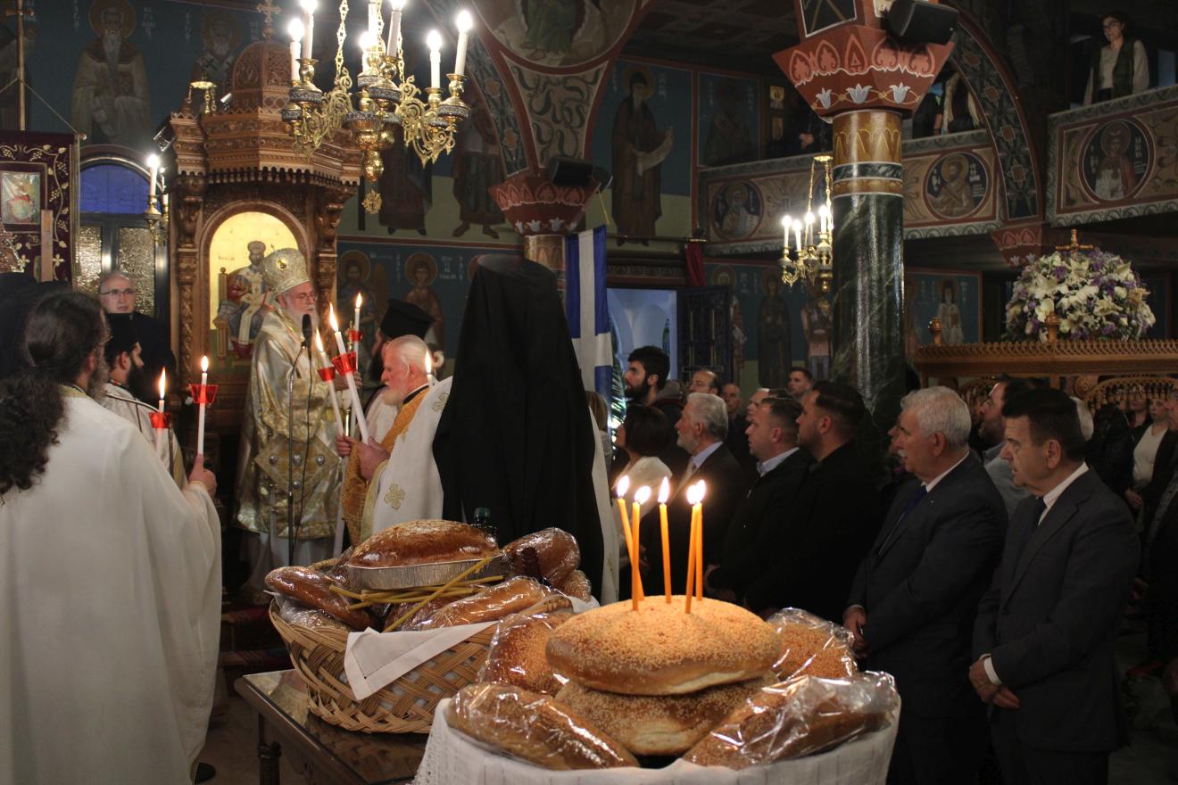 Μετά την αρτοκλασία και πριν την απόλυση ο Σεβασμιώτατος με αφορμή το πρώτο τροπάριο των εσπερίων της εορτής: «Ξένα καὶ παράδοξα, τῶν οὐρανῶν ὁ Δεσπότης, ἐπὶ σοὶ τετέλεκε, καταρχὰς Πανάμωμε· καὶ γὰρ ἄνωθεν, ἐμφανῶς ἔσταξεν, ὑετὸς καθάπερ, ἐν τῇ μήτρᾳ σου Θεόνυμφε, Πηγὴν δεικνύων σε, σύμπαν ἀγαθὸν ἀναβλύζουσαν, πλημμύραν τε ἰάσεων, τὰς εὐεργεσίας προρρέουσαν ἅπασιν ἀφθόνως, τοῖς χρῄζουσι τὴν ῥῶσιν τῶν ψυχῶν, καὶ τήν ὑγείαν τοῦ σώματος, ὕδατι τῆς χάριτος», το οποίο συνδέεται άμεσα μεν με το αναστάσιμο κλίμα της περιόδου, αναφέρεται δε στο παράδοξο γεγονός της ενσάρκωσης του Θεού μέσω της Παρθένου, η οποία έγινε πηγή ζωής, καθώς γέννησε το «ύδωρ το ζών», τον Χριστό και παρέχει ιάματα και ψυχικά και σωματικά σε όσους την επικαλούνται με πίστη, υπογραμμίζοντας έτσι τον διπλό ρόλο της Παναγίας, ως της Μητέρας του Θεού και της «Ζωοδόχου Πηγής» και ευχήθηκε σε όλους με τον αναστάσιμο χαιρετισμό «Χριστός Ανέστη», έτη πολλά και ευλογημένα.