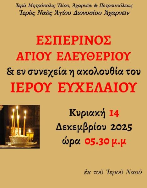 Ευχέλαιο θα τελεστεί στον Ιερό Ναό Αγίου Διονυσίου Αχαρνών την Κυριακή 14 Δεκεμβρίου 2025, στις 17:30.