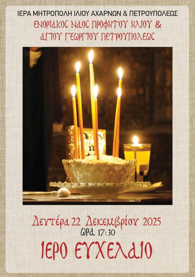 Τὴν Δευτέρα 22 Δεκεμβρίου 2025, στὸν Ἱερὸ Ναὸ Προφήτου Ἠλιοῦ Πετρουπόλεως καί ὥρα 17:30 θὰ τελεσθεῖ τὸ μυστήριο Ἱεροῦ Εὐχελαίου.