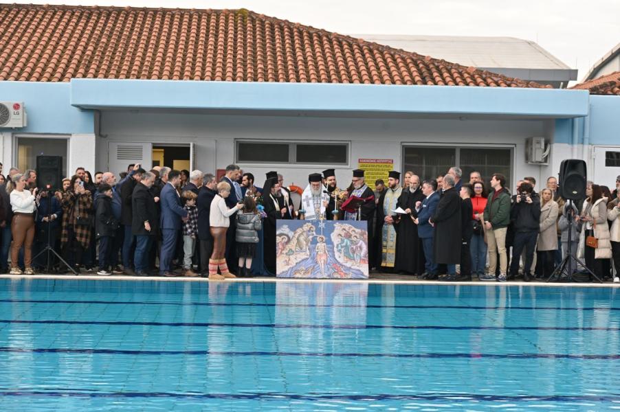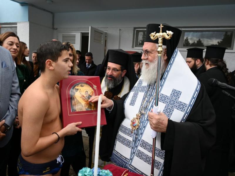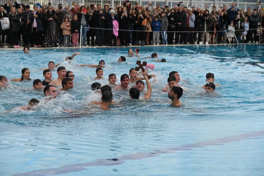 Στην φιλόξενη πισίνα του Ολυμπιακού Χωριού συναγωνίσθηκαν για την λήψη του Τιμίου Σταυρού πάνω από είκοσι παιδιά - αγόρια και κορίτσια - δεινοί κολυμβητές. Όλα δέχθηκαν τις ευχές του Σεβασμιωτάτου και σε εκείνον που έφτασε πρώτος στον Σταυρό δόθηκε εικόνα της Παναγίας.