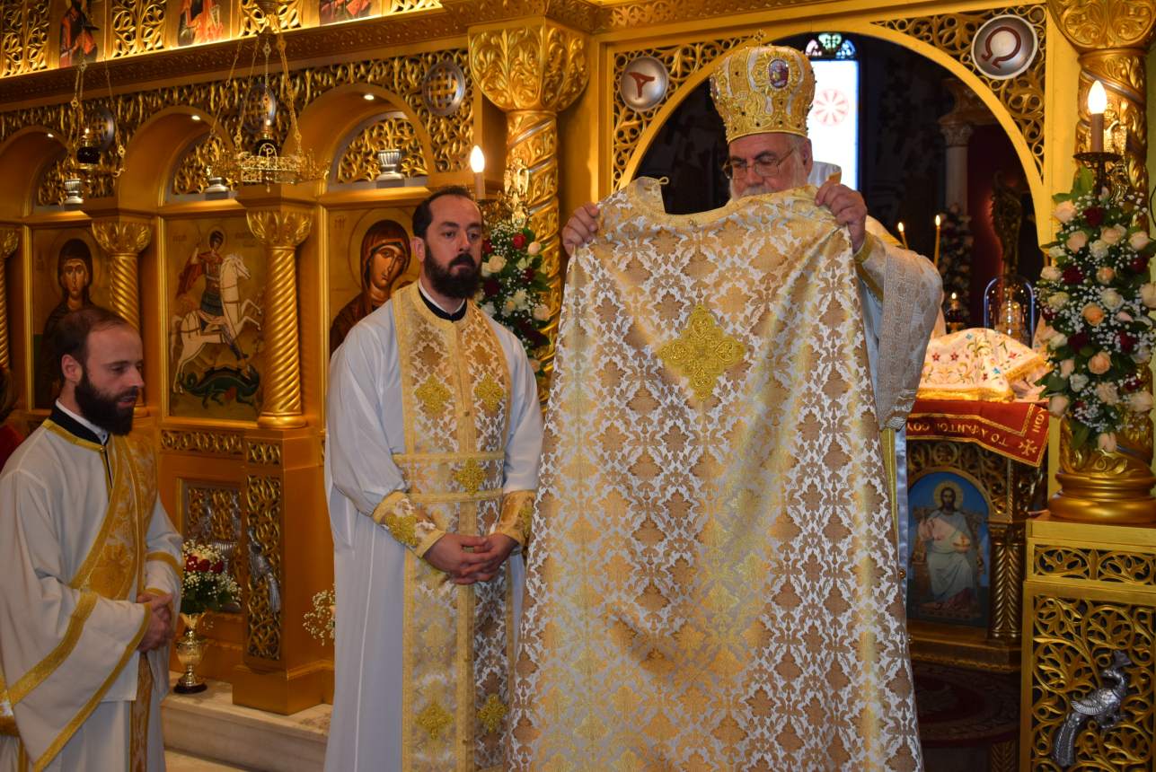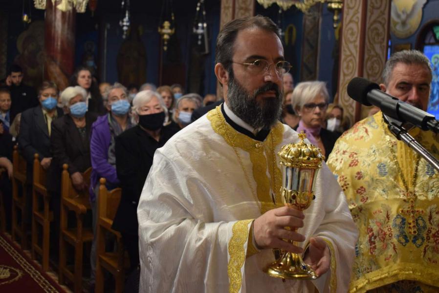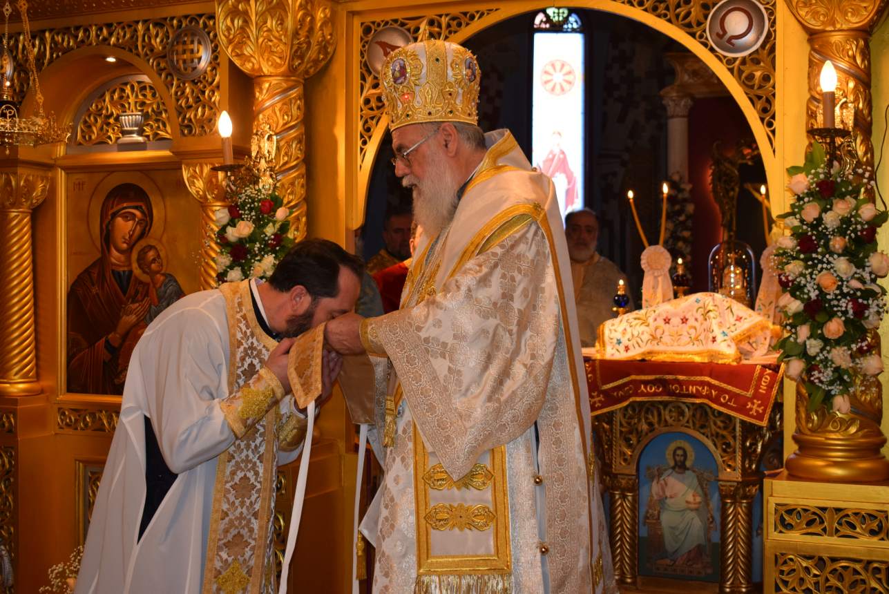 Συλλειτούργησαν ο Πρωτοσύγκελλος της Ιεράς Μητροπόλεως Αρχιμ. Νικόδημος Αθανασίου και άλλοι κληρικοί. Μετά τον σύντομο χειροτονητήριο λόγο του διακόνου, ο Σεβασμιώτατος αντιφώνησε με τη φράση του Αποστόλου Παύλου από το αποστολικό ανάγνωσμα της ημέρας «Χριστῷ συνεσταύρωμαι· ζῶ δὲ οὐκέτι ἐγώ, ζῇ δὲ ἐν ἐμοὶ Χριστός» και ομίλησε περί του τρόπου διακονίας στην Εκκλησία. Προέτρεψε τον νέο πρεσβύτερο να χρησιμοποιήσει τα τάλαντα που του χάρισε ο Θεός για τη διακονία των πιστών, επιτρέποντας στον Χριστό να ενεργεί μέσω αυτού για τη σωτηρία των ανθρώπων.