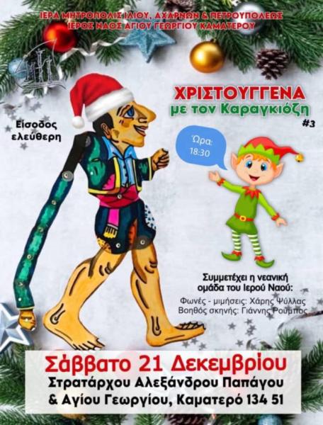 Η νεανική ομάδα του Ι.Ν. Αγίου Γεωργίου Καματερού σας προσκαλεί στη Χριστουγεννιάτικη παράσταση θεάτρου σκιών με τίτλο «ΧΡΙΣΤΟΥΓΕΝΝΑ με τον Καραγκιόζη #3».