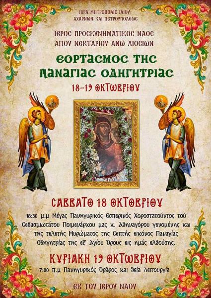 Ο Ιερός Προσκυνηματικός Ναός Αγίου Νεκταρίου Άνω Λιοσίων πανηγυρίζει την Παναγία την οδηγήτρια, σύμφωνα με το ακόλουθο πρόγραμμα: