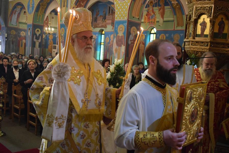 Το πέρας της Θείας Λειτουργίας ακολούθησε η λιτάνευση των ιερών εικόνων κατά την οποία ο Σεβασμιώτατος ανέγνωσε το «Συνοδικόν της Ορθοδοξίας» των θεοφόρων Πατέρων ημών, οι οποίοι συνεκρότησαν στην Νίκαια την Ζ’ Οικουμενική Σύνοδο.