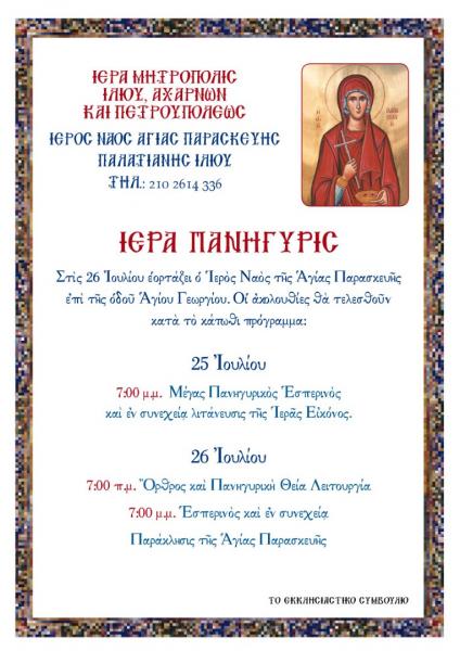 Την Κυριακή 26 Ιουλίου 2015 πανηγυρίζει το Ιερό Παρεκκλήσιο της Αγίας Παρασκευής, που βρίσκεται στα όρια της ενορίας της Κοιμήσεως Θεοτόκου Παλατιανής Ιλίου.