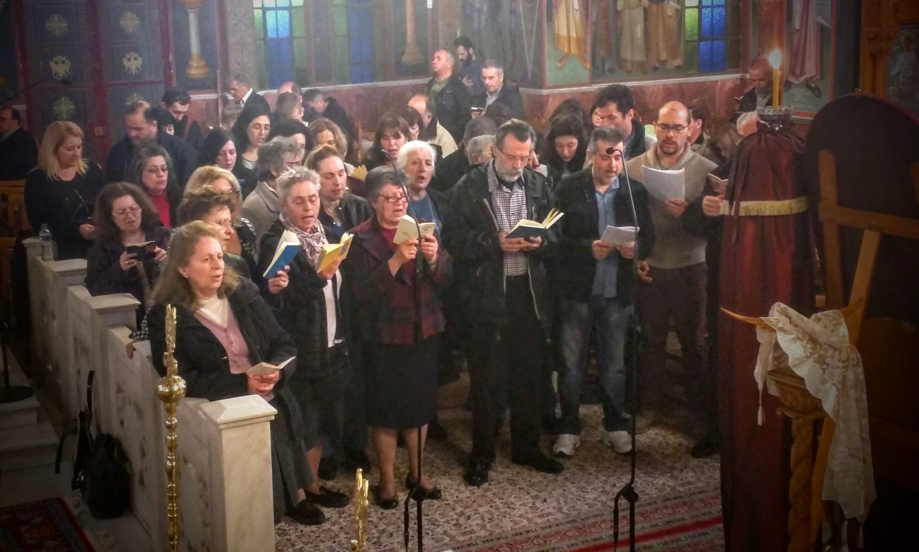Στη δεύτερη τέλεση της ακολουθίας των Χαιρετισμών, που γίνεται κάθε Παρασκευή στις 21:00-22:15, ψάλλει η χορωδία και μαζί της «παρασύρονται» και οι υπόλοιποι συμμετέχοντες.