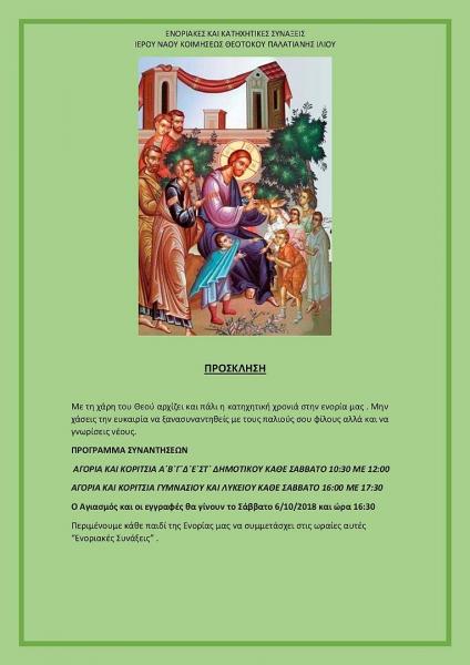 Με τη χάρη Θεού αρχίζει και πάλι η κατηχητική χρονιά στην ενορία της Κοιμήσεως Θεοτόκου Παλατιανής Ιλίου. Μην χάσεις την ευκαιρία να ξανασυναντηθείς με τους παλιούς σου φίλους αλλά και να γνωρίσεις νέους.