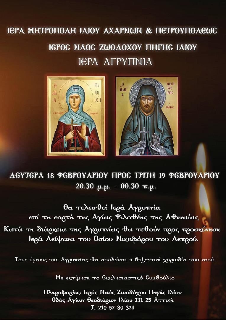 Ιερά Αγρυπνία θα τελεστεί στον Ι.Ν. Ζωοδόχου Πηγής Ιλίου επί τη εορτή της Αγίας Φιλοθέης της Αθηναίας, τη Δευτέρα 18 Φεβρουαρίου 2019.