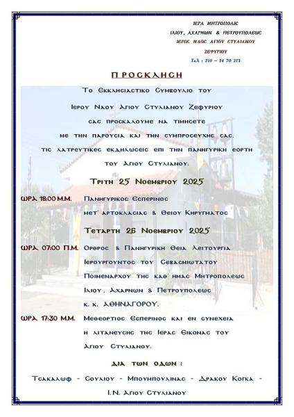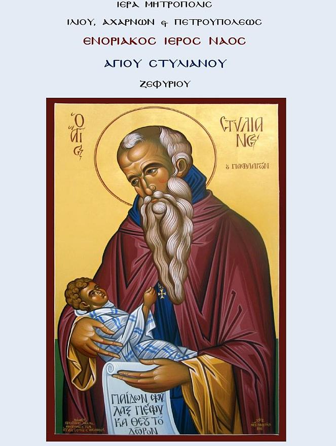 Το Εκκλησιαστικό Συμβούλιο του Ιερού Ναού Αγίου Στυλιανού Ζεφυρίου σας προσκαλούμε να τιμήσετε με την παρουσία και την συμπροσευχή σας τις λατρευτικές εκδηλώσεις επί τη πανηγυρική εορτή του Αγίου Στυλιανού, κατά το ακόλουθο πρόγραμμα: