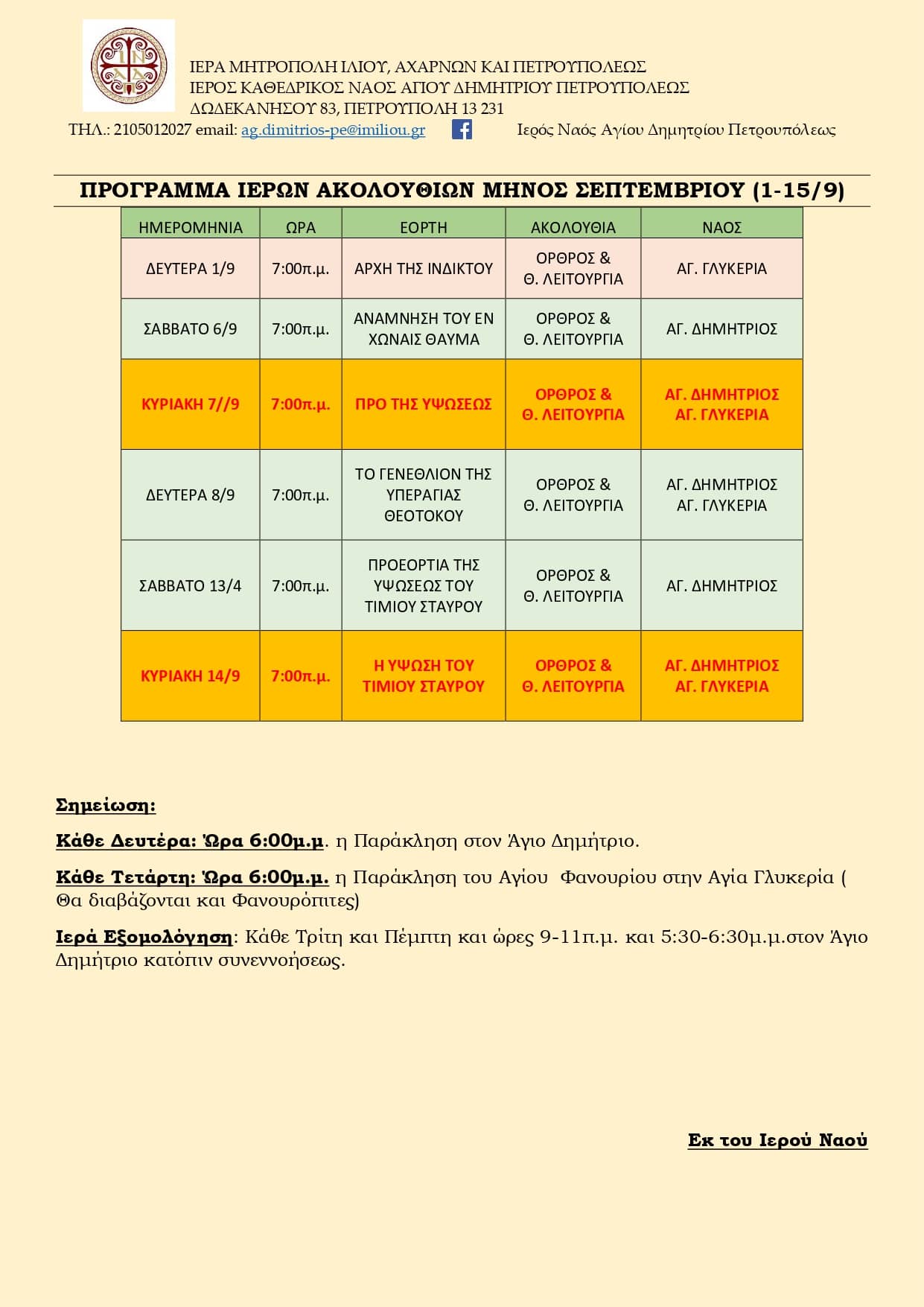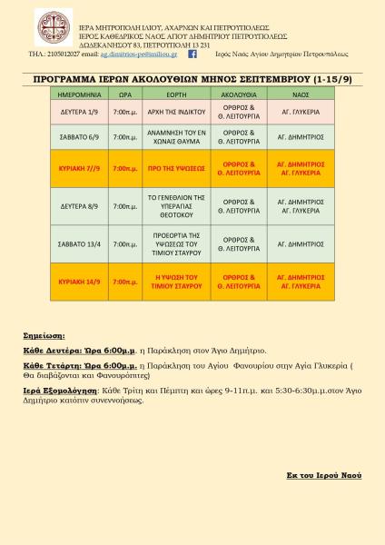 Πρόγραμμα ακολουθιών Α' δεκαπενθημέρου Σεπτεμβρίου 2025 ενορίας Αγ. Δημητρίου Πετρ.