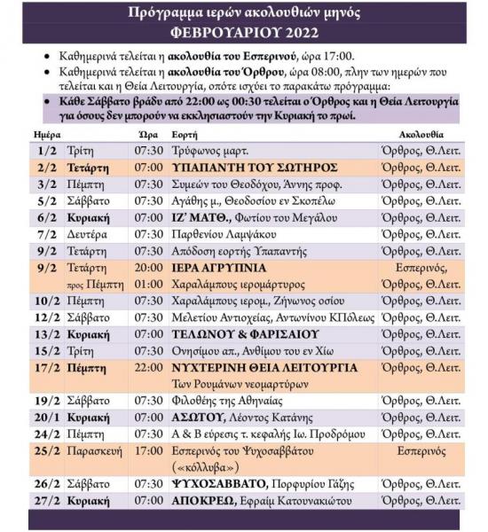 Πρόγραμμα ακολουθιών Φεβρουαρίου 2022 ενορίας Αγ. Βαρβάρας Ιλίου