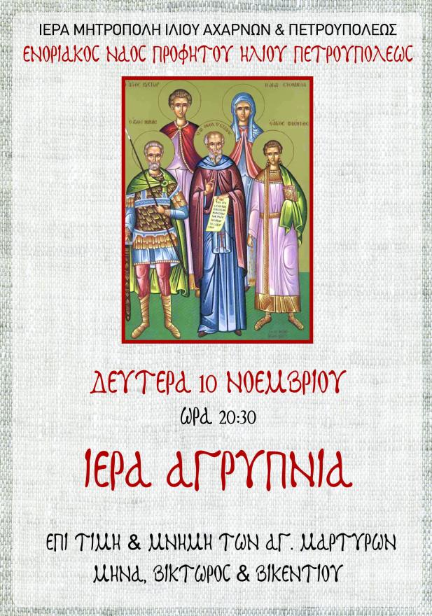 • Δευτέρα 10 Νοεμβρίου, ώρα 20:00, Ιερά αγρυπνία, επί τιμή και μνήμη των Αγίων Μηνά, Βίκτωρος και Βικεντίου.