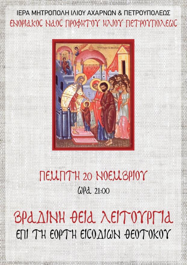• Πέμπτη 20 Νοεμβρίου, ώρα 21:00, βραδινή Θεία Λειτουργία, επί τη εορτή των Εισοδίων της Υπεραγίας ημών Θεοτόκου και Αειπαρθένου Μαρίας.