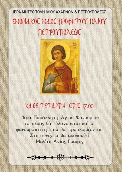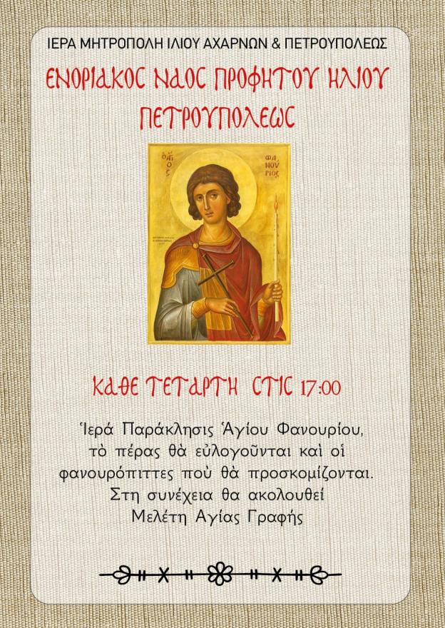 • Κάθε Τετάρτη, ώρα 17:00, Ιερά Παράκληση στον Άγιο Μεγαλομάρτυρο Φανούριο τον νεοφανή και θαυματουργό και ευλογία των πλακούντων που προσκομίζονται. Μετά το πέρας της Παράκλησης Κύκλος μελέτης Αγίας Γραφής.