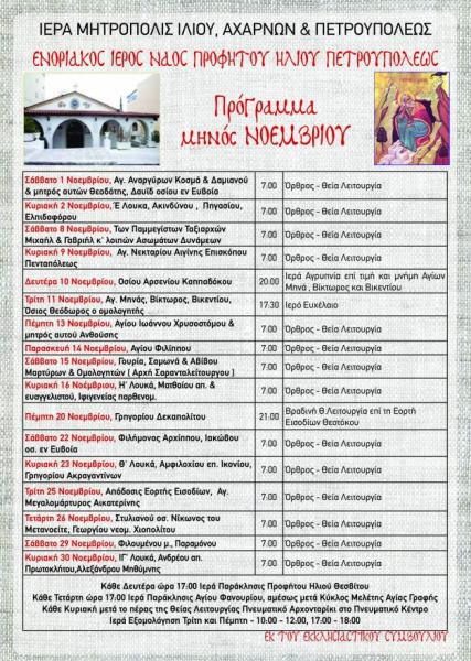 Πρόγραμμα ακολουθιών Νοεμβρίου 2025 ενορίας Προφήτου Ηλιού Πετρ.