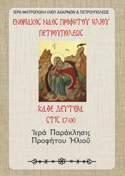 • Κάθε Δευτέρα, ώρα 17:00, Ιερά Παράκληση στον Προφήτη Ηλία.