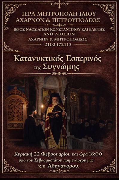 Στον Ιερό Ναό Αγίων Κωνσταντίνου και Ελένης Άνω Λιοσίων θα χοροστατήσει ο Σεβασμιώτατος Μητροπολίτης Ιλίου κ. Αθηναγόρας, κατά τον Α' κατανυκτικό Εσπερινό, τον λεγόμενο «της συγγνώμης», την Κυριακή 22/2/2026, στις 18:00.