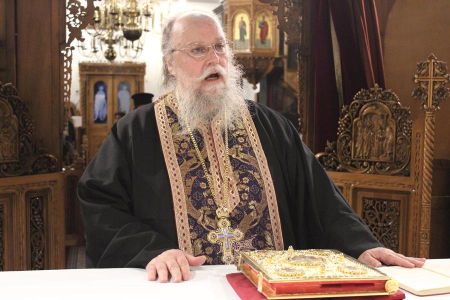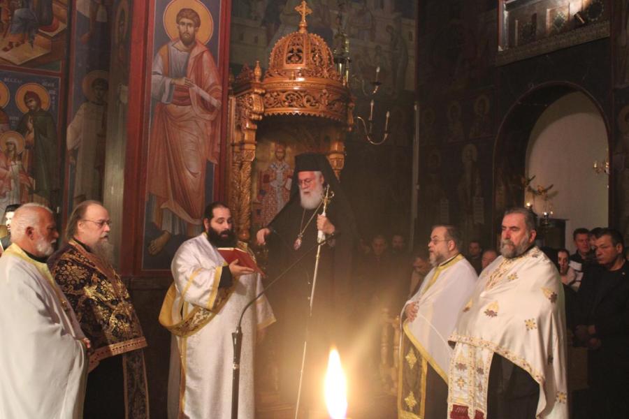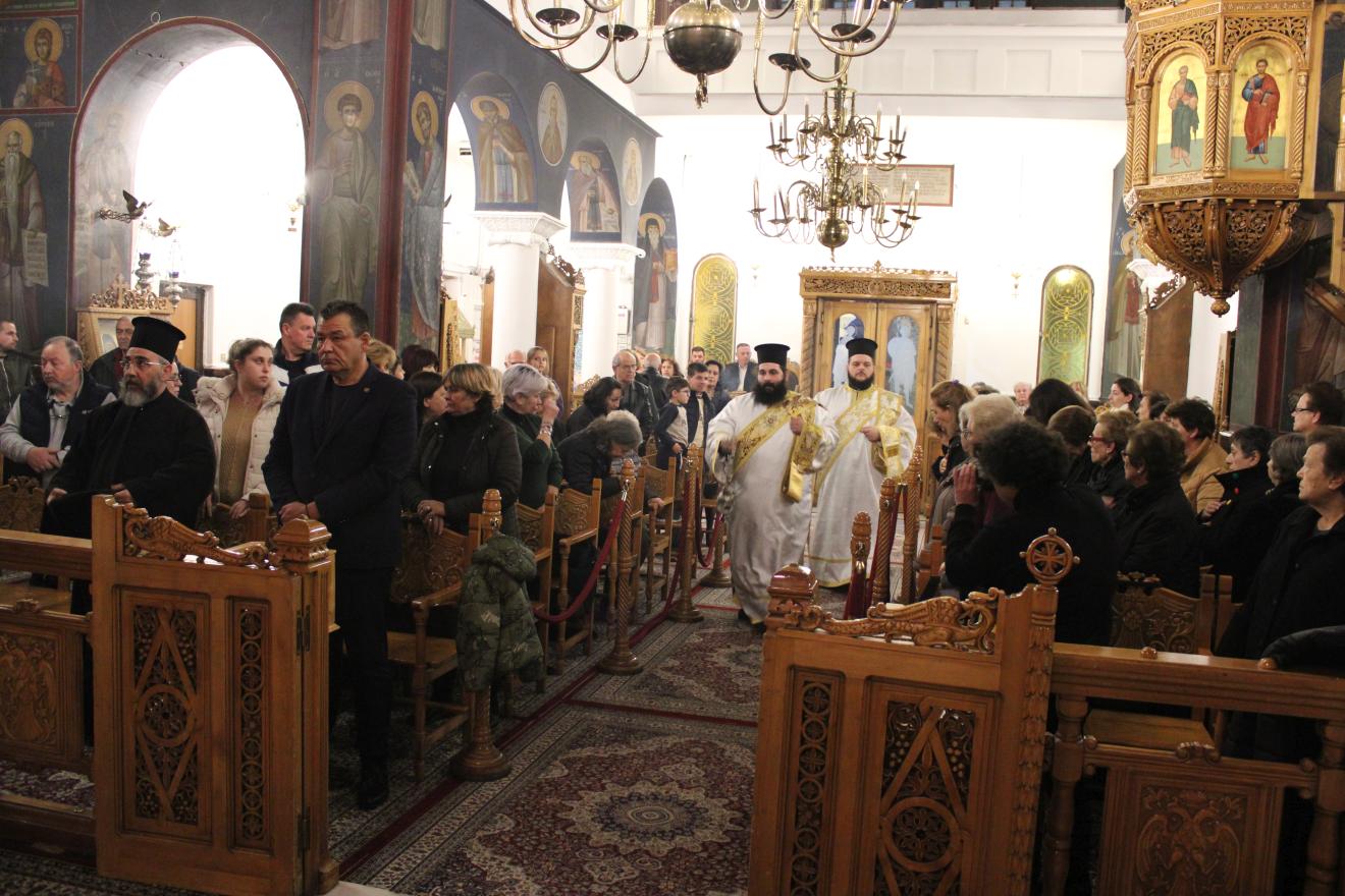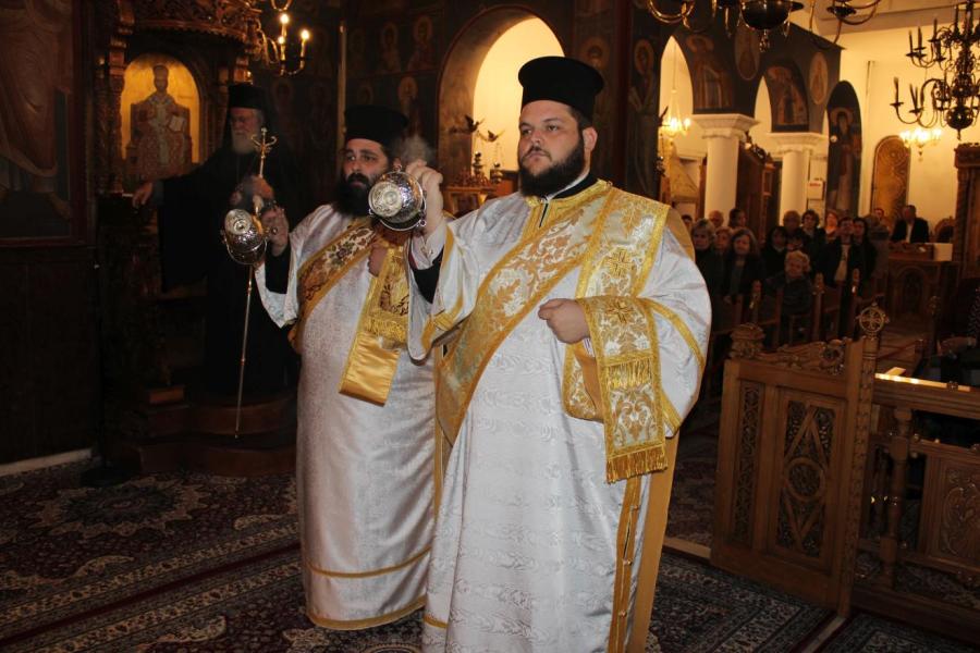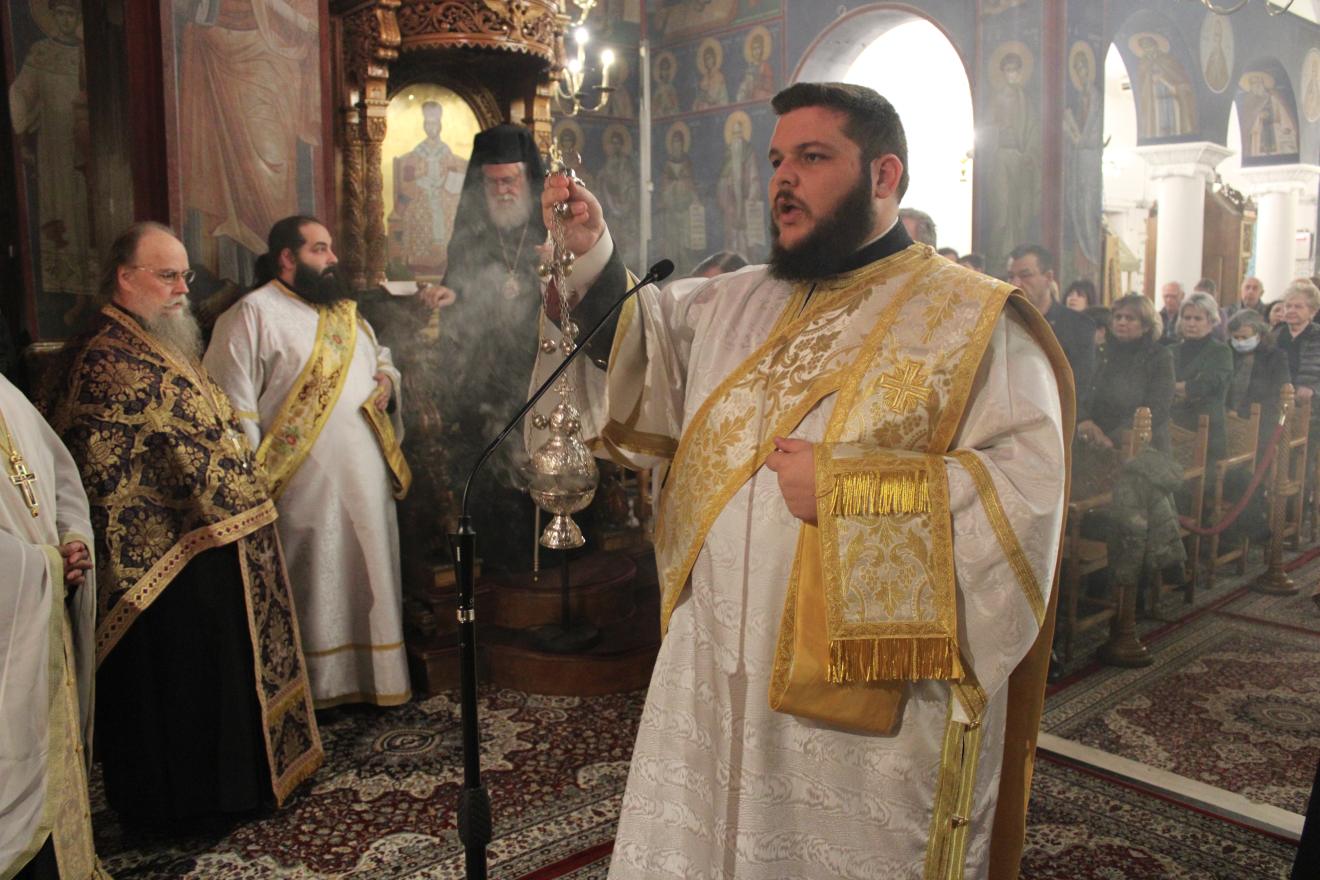 συμπαραστατούμενος από τους Αρχιμ. Ιωάννη Ράπτη - Γενικό Αρχιερατικό Επίτροπο της Ιεράς Μητροπόλεως, Αρχιμ. Αγαθάγγελο Κόκλα - ιεροκήρυκα της Ιεράς Μητροπόλεως, Αρχιμ. Τίτο Χρήστου - Πρόεδρο του Εκκλ. Συμβουλίου του Ιερού Ναού και Αρχιερατικό Επίτροπο Φυλής και Αχαρνών, Αρχιμ. Εφραίμ Χριστοφοράκη - Πρόεδρο του Εκκλ. Συμβουλίου του Ι. Ν. Αγ. Δημητρίου Πετρουπόλεως και Αρχιερατικό Επίτροπο Πετρουπόλεως, Αρχιμ. Μιχαήλ Γιαννακέλο - Πρόεδρο του Εκκλ. Συμβουλίου του Ι. Ν. Κοιμήσεως της Θεοτόκου Αχαρνών, π. Πέτρο Θεοδοσίου - Πρόεδρο του Εκκλ. Συμβουλίου του Ι. Ν. Αγ. Παντελεήμονα Κρυονερίου, π. Ευάγγελο Κοντογιάννη - Πρόεδρο του του Εκκλ. Συμβουλίου του Ι. Ν. Αγ. Γεωργίου Αχαρνών, π. Φανούριο Μπριλή - Πρόεδρο του Εκκλ. Συμβουλίου του Ι. Ν. Αγ. Δημητρίου Άνω Λιοσίων, τους εφημερίους του Ιερού Ναού, εφημερίους ομόρων ενοριών από τις αρχιερατικές περιφέρειες Άνω Λιοσίων και Αχαρνών και τους διακόνους του π. Άγγελο Μιχαλόπουλο και π. Καλλίνικο Ζωγράφο.
