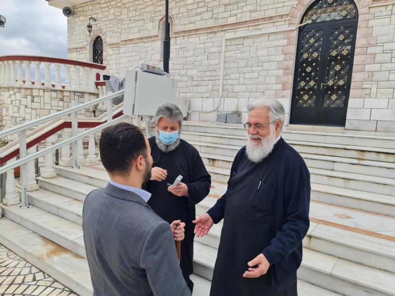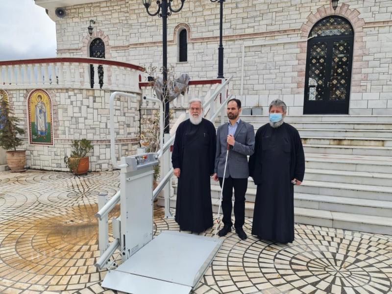 Στην συνέχεια, ο Σεβασμιώτατος μαζί με τον κ. Αυγουλά επισκέφτηκαν τον Ιερό Ναό Αγίου Γεωργίου Καματερού προκειμένου να επιθεωρήσουν τον αναβατήρα που τοποθετήθηκε στον ναό για να διευκολύνει την πρόσβαση σε άτομα με κινητικά προβλήματα και σε ηλικιωμένους.