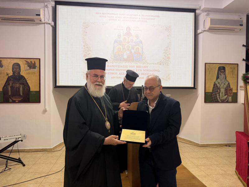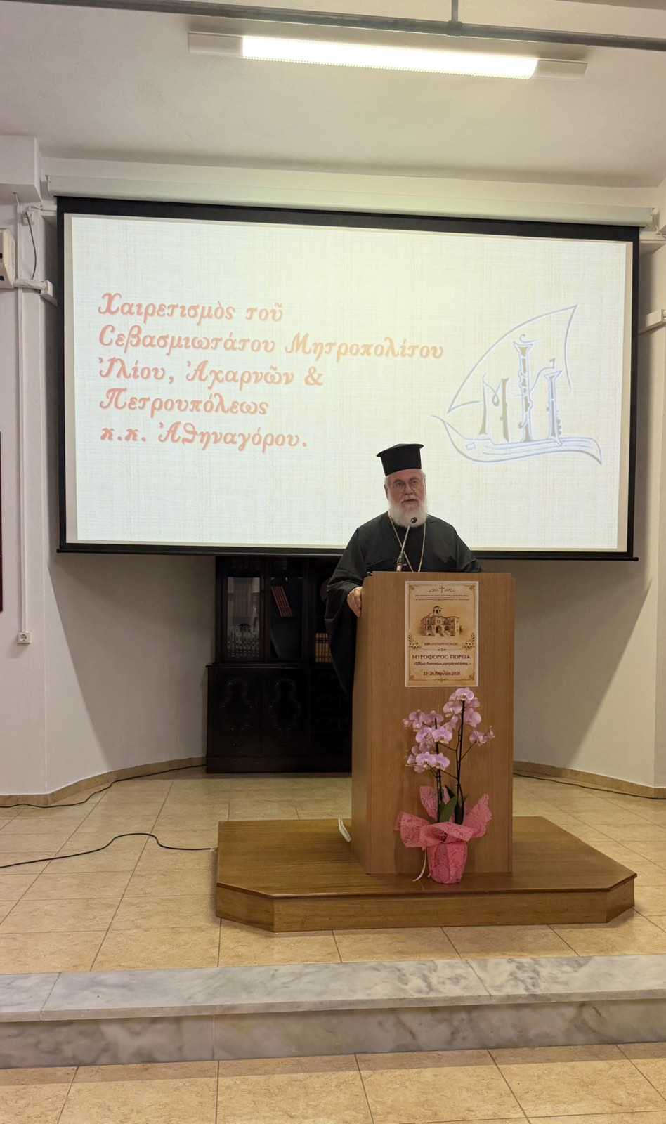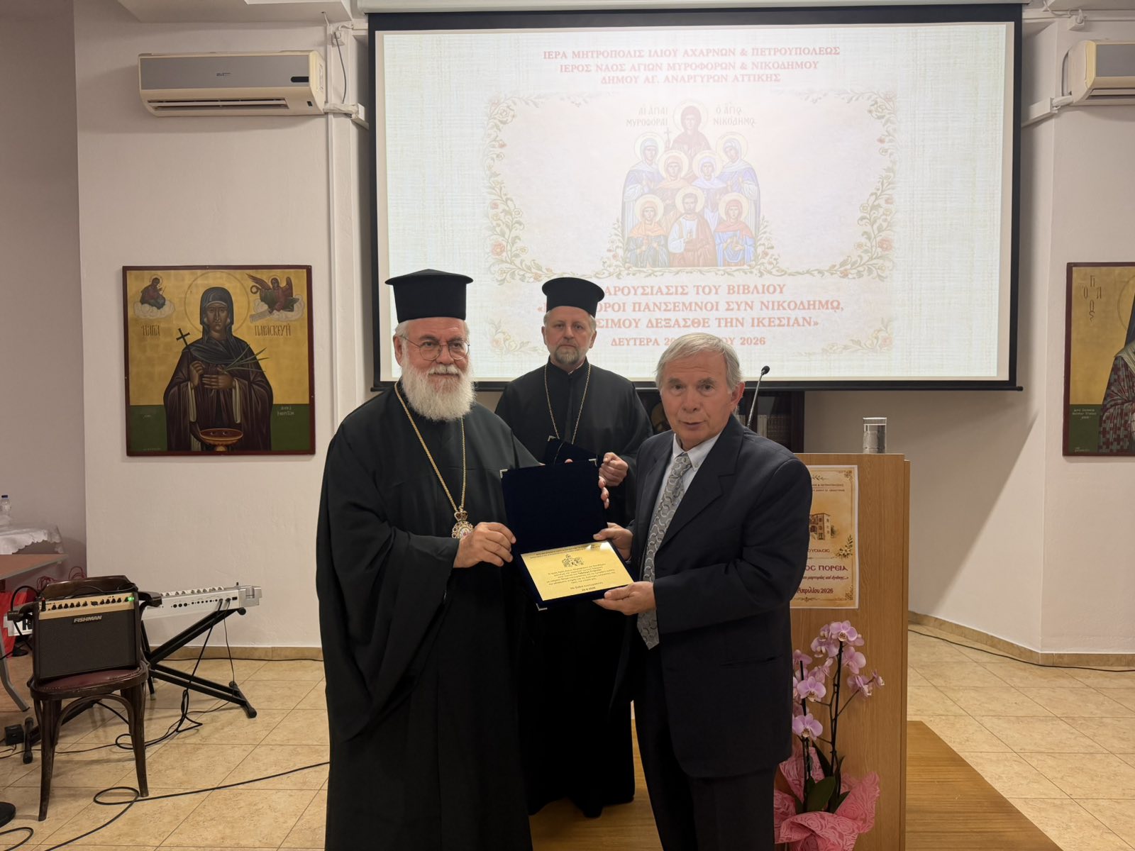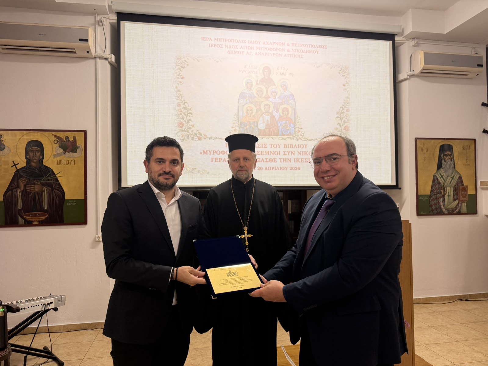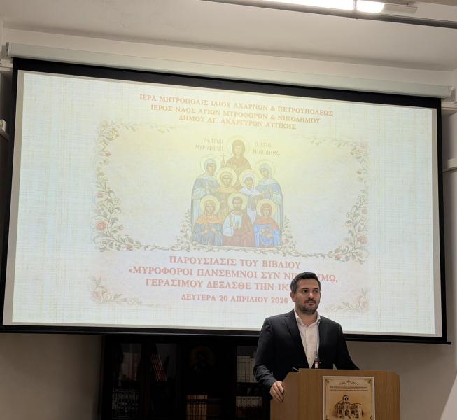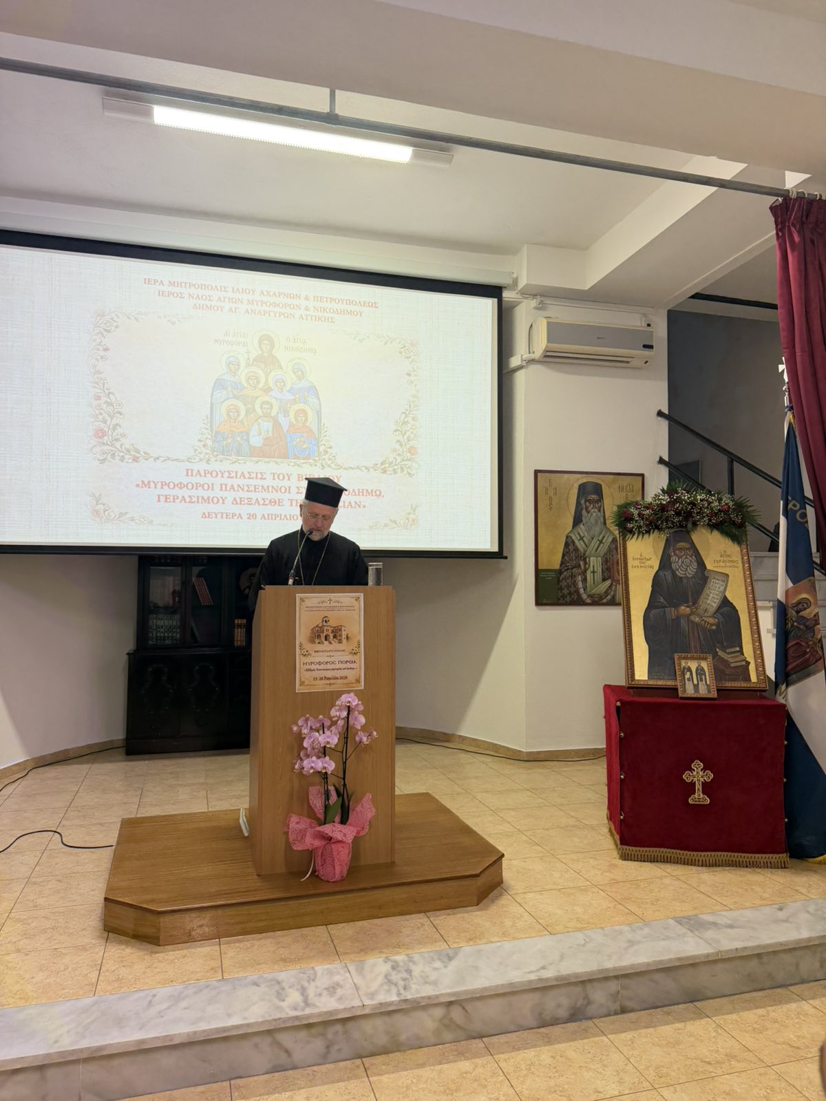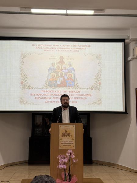 Την Δευτέρα 20 Απριλίου 2026 το απόγευμα, ο Σεβασμιώτατος Μητροπολίτης Ιλίου, Αχαρνών και Πετρουπόλεως κ. Αθηναγόρας παρέστη στην παρουσίαση του βιβλίου «Μυροφόροι συν Νικοδήμω, δέξασθε Γερασίμου την ικεσίαν», το οποίο συνέγραψε ο π. Κωνσταντίνος Λαμπρόπουλος, Πρόεδρος του Εκκλησιαστικού Συμβουλίου του Ιερού ενοριακού Ναού των Αγίων Μυροφόρων Γυναικών και Νικοδήμου του Νυχτερινού μαθητή, που ευρίσκεται στην περιοχή Ανάκασας των Αγίων Αναργύρων.