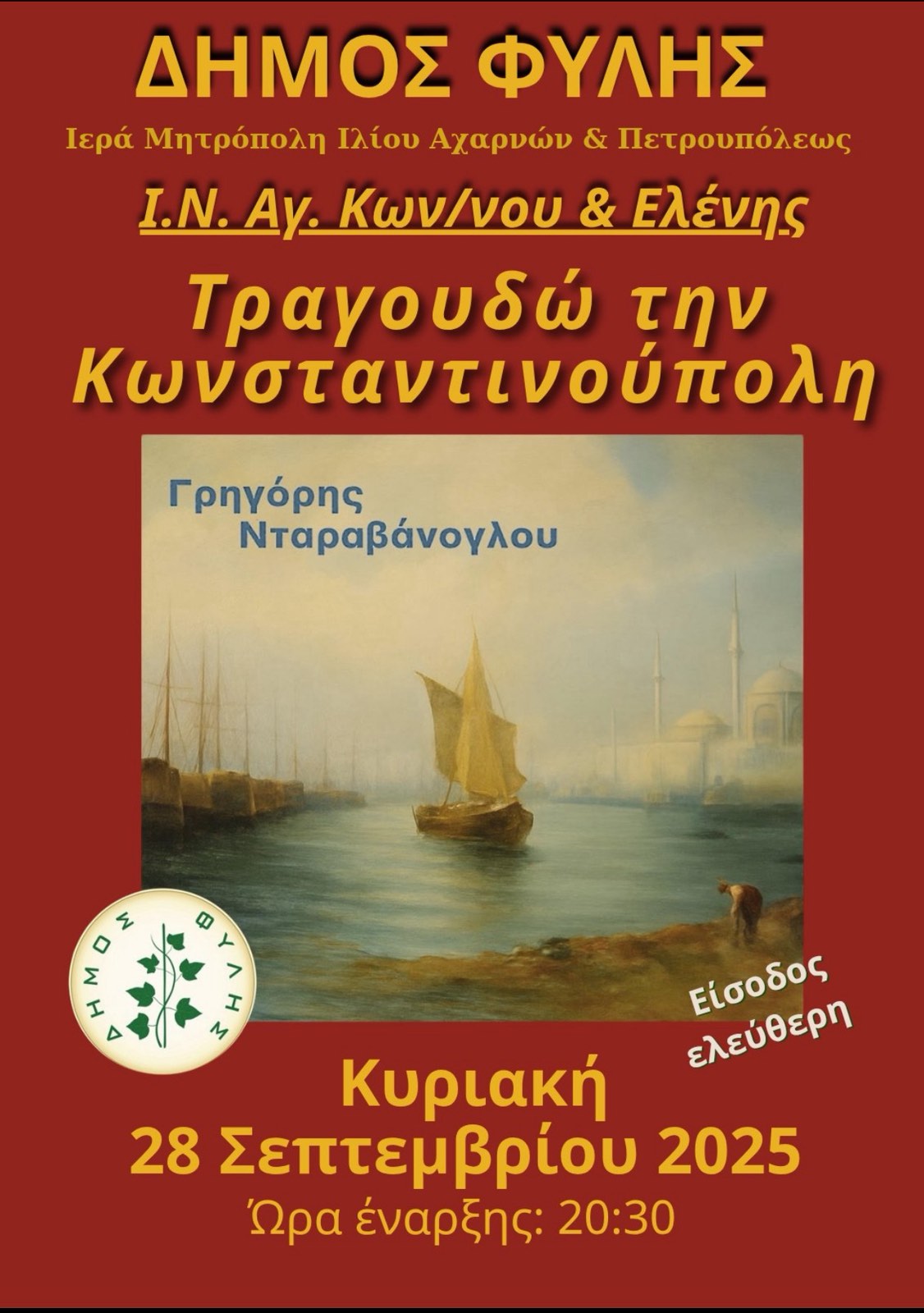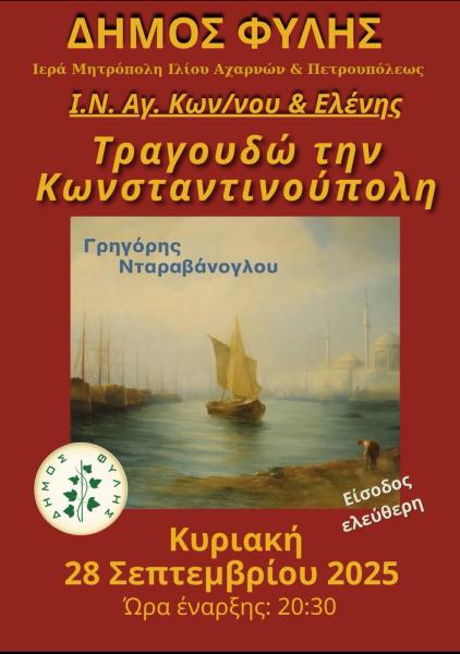 Μουσική εκδήλωση με τίτλο «Τραγουδώ την Κωνσταντινούπολη» με τον Πρωτοψάλτη Γρηγόριο Νταραβάνογλου θα πραγματοποιηθεί στον Ιερό Ναό Αγίων Κωνσταντίνου και Ελένης Άνω Λιοσίων την Κυριακή 28 Σεπτεμβρίου 2025, στις 20:30.