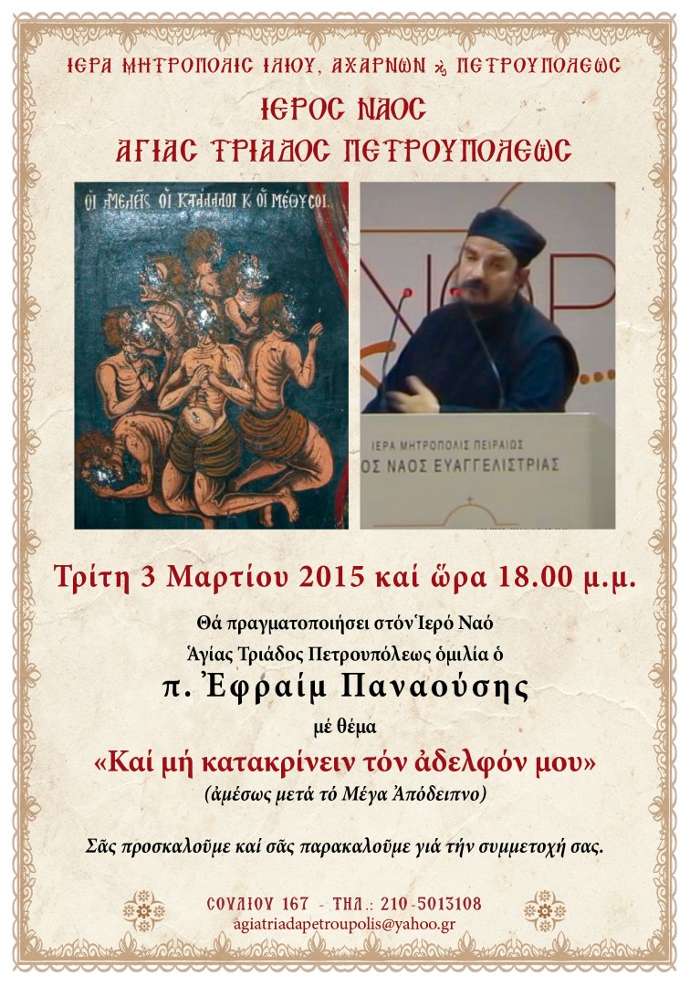 Τρίτη 3 Μαρτίου 2015 και ώρα 18:00, στον Ι.Ν. Αγ. Τριάδος Πετρουπόλεως.