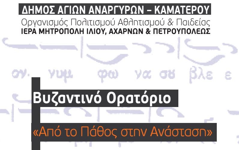 Το Βυζαντινό Ορατόριο «Από το Πάθος στην Ανάσταση» θα παρουσιαστεί στον Ι.Ν. Αγ. Αναργύρων του Δήμου Αγ. Αναργύρων, την Παρασκευή 3 Απριλίου 2015 και ώρα 19:00.