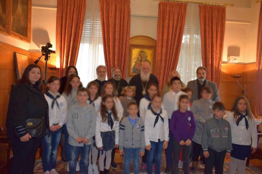 Με τη συνοδεία του Σεβασμιωτάτου Μητροπολίτου Ιλίου, Αχαρνών και Πετρουπόλεως και των δασκάλων τους, τα παιδιά του Δημοτικού Σχολείου της περιοχής του καταυλισμού του Στρατοπέδου ΚΑΠΟΤΑ στις Αχαρνές, επισκέφθηκαν τον Μακαριώτατο Αρχιεπίσκοπο Αθηνών και πάσης Ελλάδος κ. Ιερώνυμο για να ψάλλουν τα κάλαντα.