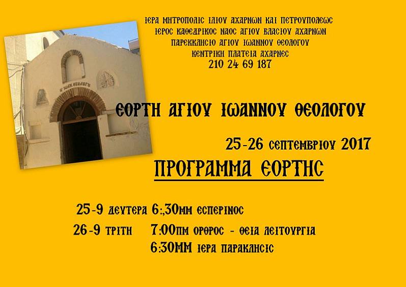 26 Σεπτεμβρίου 2017 07:00 Όρθρος και Θεία Λειτουργία 18:30 Ιερά Παράκλησις
