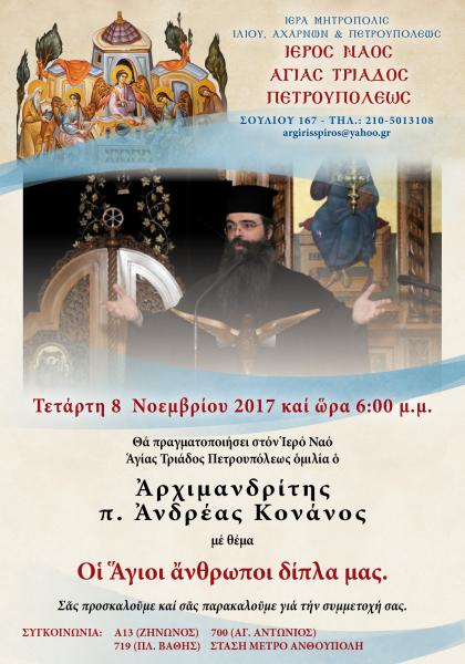 Ο π. Ανδρέας Κονάνος θα πραγματοποιήσει ομιλία στον Ιερό Ναό Αγίας Τριάδας Πετρουπόλεως με θέμα «Οι Άγιοι Άνθρωποι δίπλα μας».
