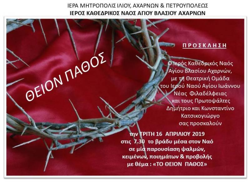 Ο Ιερός Καθεδρικός Ναός Αγίου Βλασίου Αχαρνών, με τη θεατρική ομάδα του Ι. Ναού Αγίου Ιωάννου Νέας Φιλαδέλφειας και τους πρωτοψάλτες Δημήτριο και Κωνσταντίνο Κατσικογιώργο σας προσκαλούν την Τρίτη 16 Απριλίου 2019 στις 7:30 το βράδυ σε μία παρουσίαση ψαλμών, κειμένων, ποιημάτων και προβολής με θέμα «Το Θείον Πάθος».