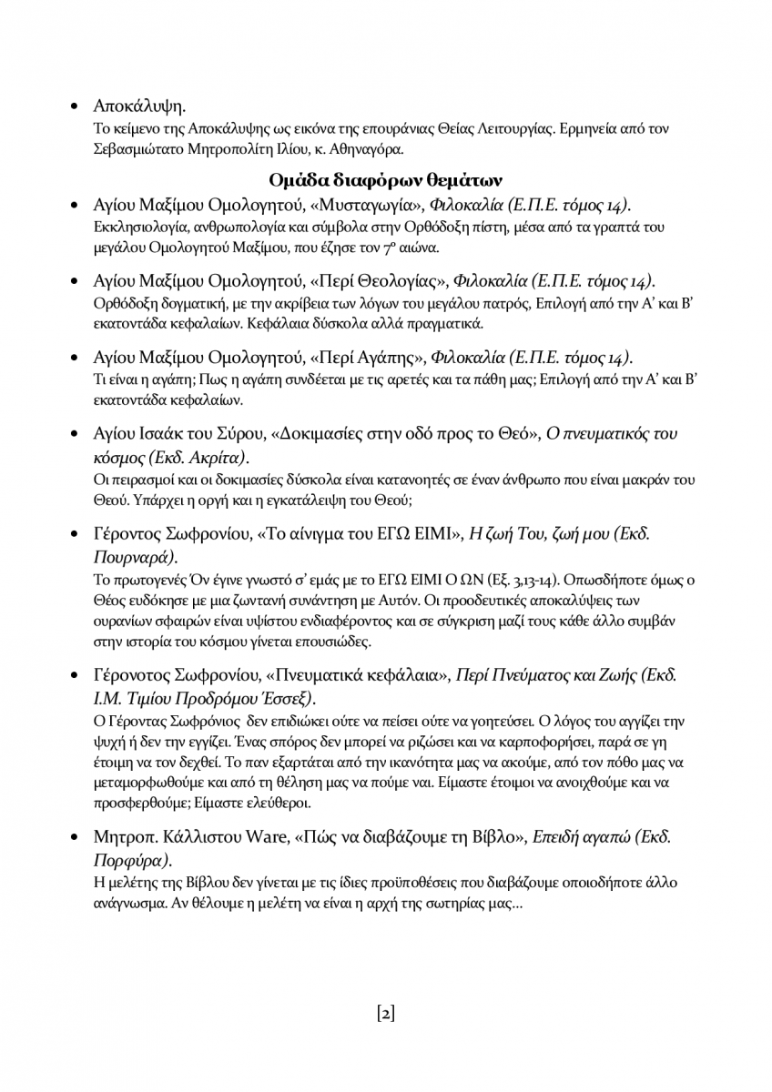 Οι συναντήσεις ξεκινούν με την τέλεση του Αποδείπνου, στο Αρχονταρίκι του ναού (το ανεξάρτητο κτήριο δίπλα στο ναό) και μετά ξεκινά η συζήτηση, η οποία διαρκεί περίπου μέχρι τις 22:00. Τα θέματα φέτος θα είναι διάφορα και θα γίνονται εναλλάξ: ένα θέμα από την Αγία Γραφή και ένα θέμα εμπνευσμένο από διάφορους συγγραφείς.