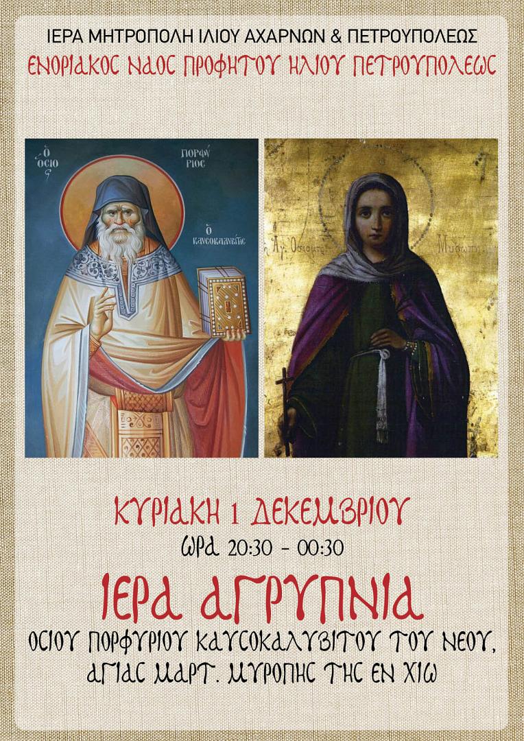 Αγρυπνία επί τη μνήμη του Οσίου Πορφυρίου του Καυσοκαλυβίτου και της Αγίας μάρτυρος Μυρόπης της εν Χίω θα τελεστεί στον Ι.Ν. Προφήτου Ηλιού Πετρουπόλεως την Κυριακή 1 Δεκεμβρίου 2019, από 20:30-00:30.