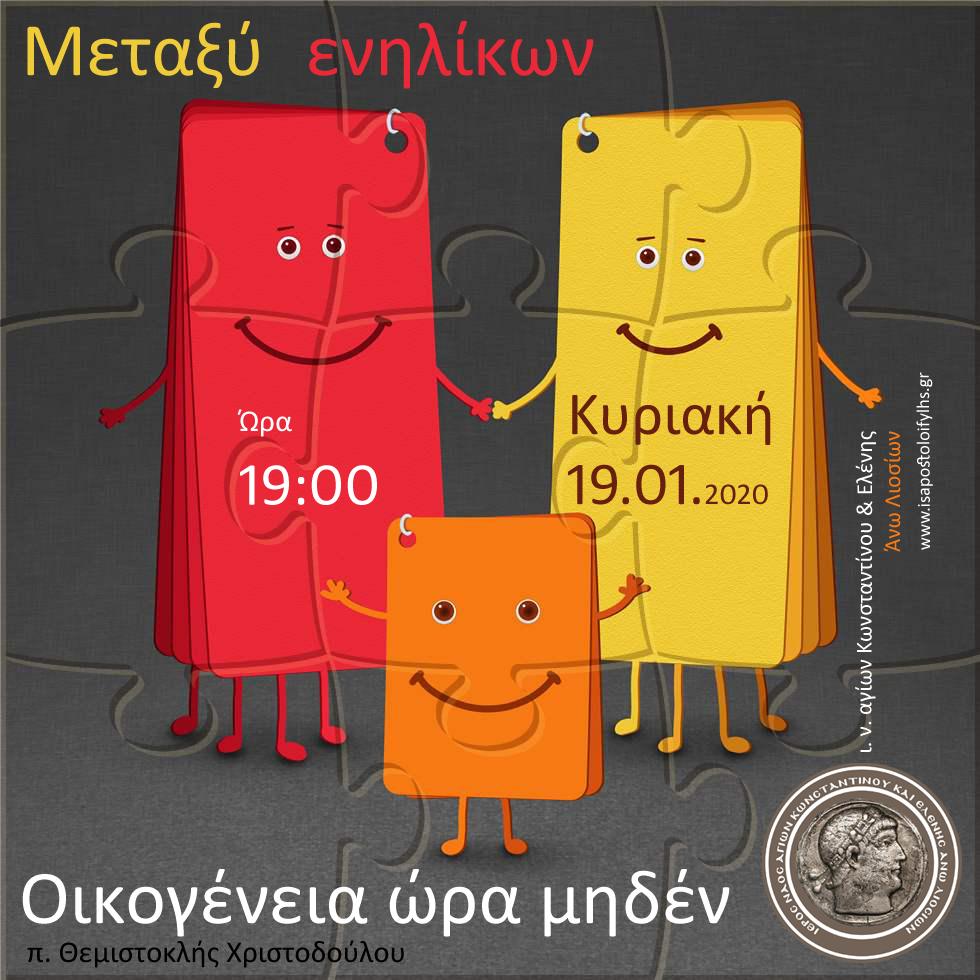 Την Κυριακή 19 Ιανουαρίου 2020 και ώρα 19:00, στον Ι.Ν. Αγίων Κωνσταντίνου & Ελένης Άνω Λιοσίων συζητούμε θέματα πνευματικής οικοδομής (δράση «Μεταξύ Ενηλίκων»). Αυτή τη φορά ο π. Θεμιστοκλής Χριστοδούλου, πολυγραφότατος, με αναγνωρισιμότητα χάρη στη συχνή ραδιοφωνική του μαρτυρία με λόγο απλό και διατρητικό θα αναπτύξει το θέμα «Οικογένεια ώρα μηδέν». Η διαρκής συμπόρευση του π. Θεμιστοκλή με τους γονείς, τα παιδιά, τα ηλικιωμένα μέλη της διευρυμένης ελληνικής οικογένειας έχει σταλάξει σε αυτόν βεβαιότητες, συμπεράσματα, ελπίδες (ίσως κι απογοητεύσεις) που προσδοκούμε να μοιραστεί μαζί μας.