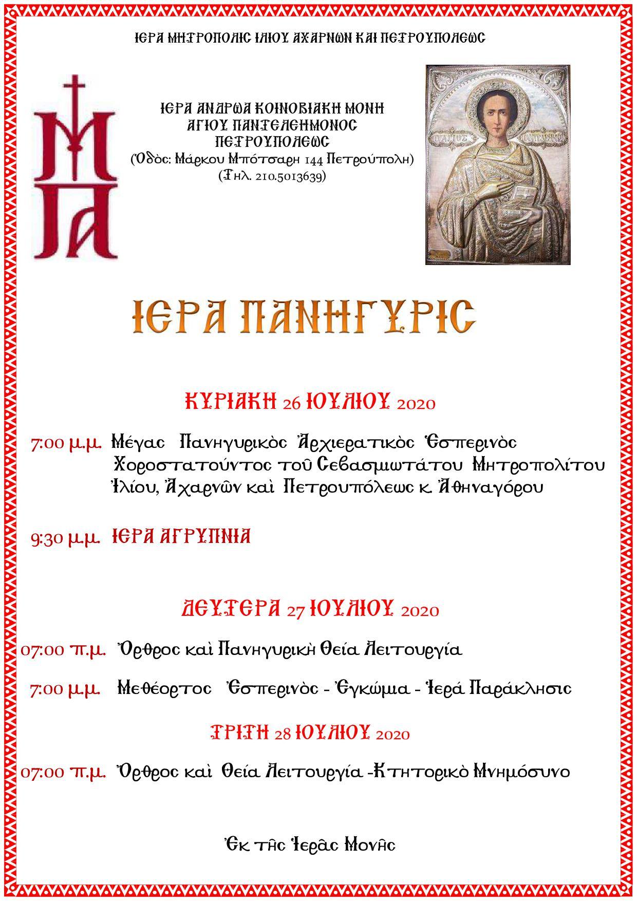 Πανηγυρίζει η Ιερά Μονή Αγίου Παντελεήμονος Πετρουπόλεως την Κυριακή 26 και τη Δευτέρα 27 Ιουλίου 2020.