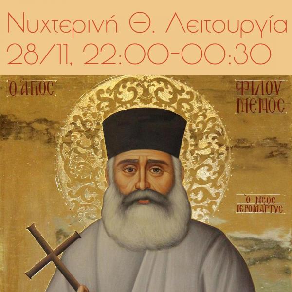 Νυχτερινή Θ. Λειτουργία Αγίου Φιλουμένου του νέου ιερομάρτυρος στην Αγ. Βαρβάρα Ιλίου