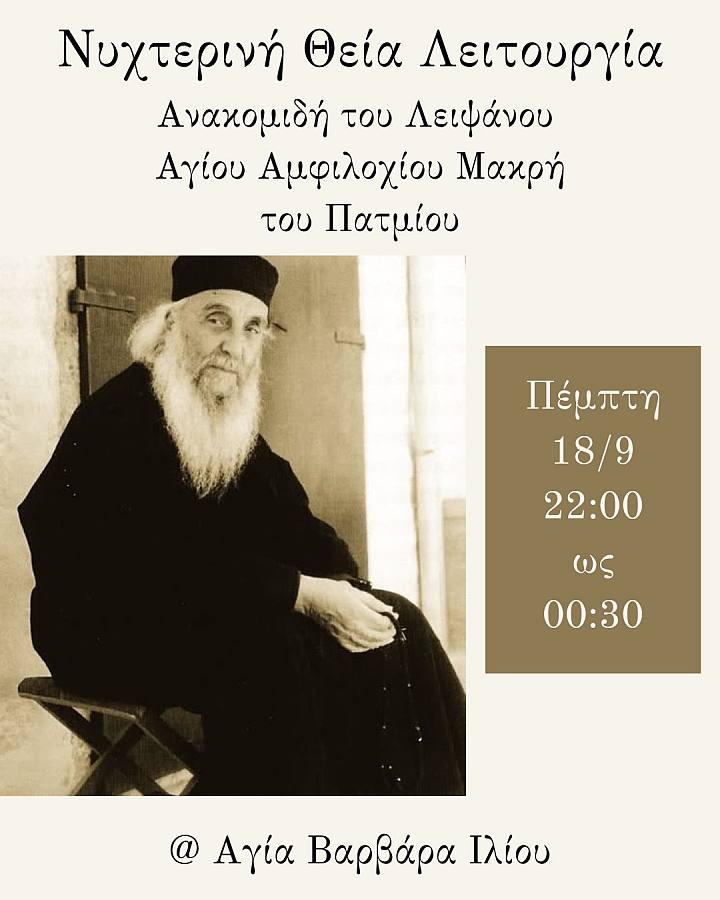 Νυχτερινή Θεία Λειτουργία με Όρθρο θα τελεστεί στην ενορία της Αγίας Βαρβάρας Ιλίου, την Πέμπτη 18 Σεπτεμβρίου 2025, από 22:00 έως 00:30 περίπου, επί τη ανακομιδή του τιμίου λειψάνου του Αγίου Αμφιλοχίου Μακρή του Πατμίου.