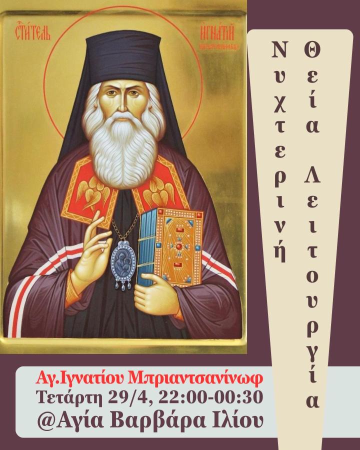 Νυχτερινή Θεία Λειτουργία επί τη εορτή του Αγίου Ιγνατίου Μπριαντσανίνωφ θα τελεστεί στον Ιερό Ναό Αγίας Βαρβάρας Ιλίου την Τετάρτη 29 Απριλίου 2026, από 22:00 έως 00:30 περίπου.