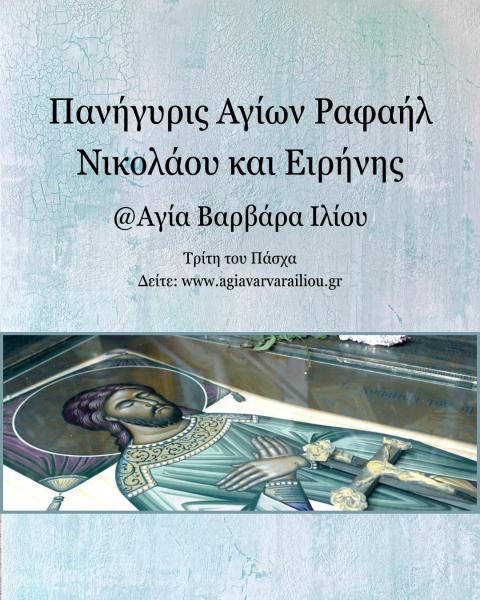 Η ενορία της Αγίας Βαρβάρας Ιλίου πανηγυρίζει τη μνήμη των Αγίων Ραφαήλ, Νικολάου και Ειρήνης την Τρίτη του Πάσχα, σύμφωνα με το ακόλουθο πρόγραμμα: