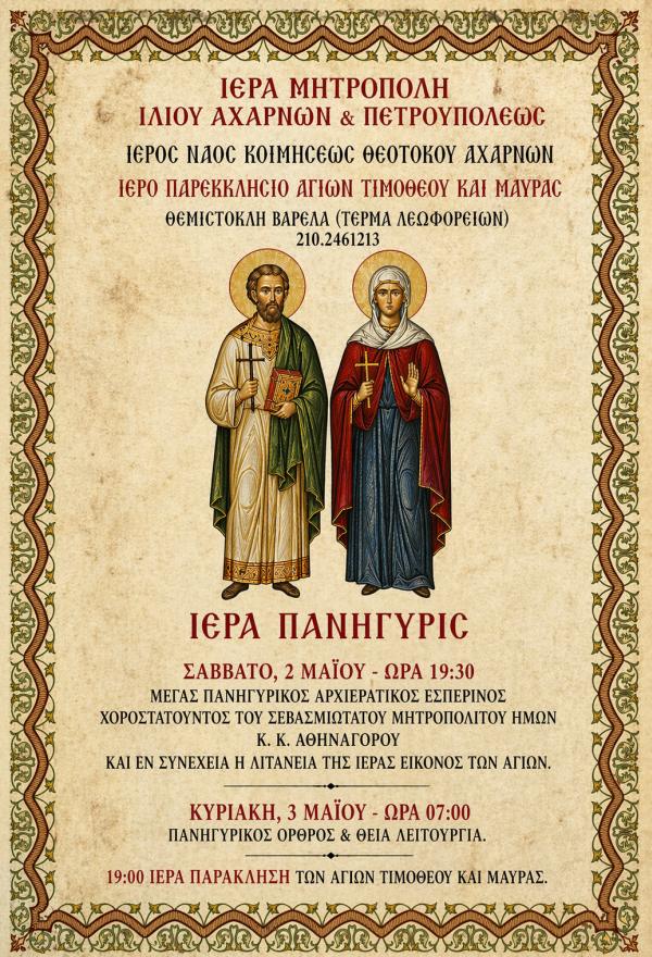 Το ιερό παρεκκλήσιο των Αγίων Τιμοθέου και Μαύρας του Ιερού Ναού Κοιμήσεως Θεοτόκου Αχαρνών πανηγυρίζει την εορτή των Αγίων σύμφωνα με το ακόλουθο πρόγραμμα: