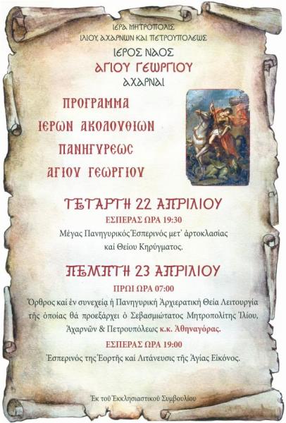 Πανηγυρίζει ο Ιερός Ναός Αγίου Γεωργίου Αχαρνών, σύμφωνα με το ακόλουθο πρόγραμμα: