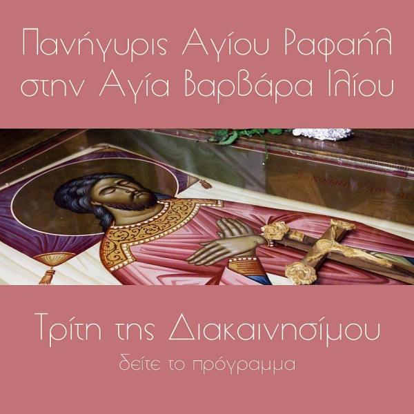 Πανηγυρίζει το παρεκκλήσιο του Αγίου Ραφαήλ την μνήμη των Αγίων νεοφανών μαρτύρων Ραφαήλ, Νικολάου και Ειρήνης, την Τρίτη της Διακαινησίμου 21 και 22 Απριλίου 2025, στον Ιερό Ναό Αγίας Βαρβάρας Ιλίου.